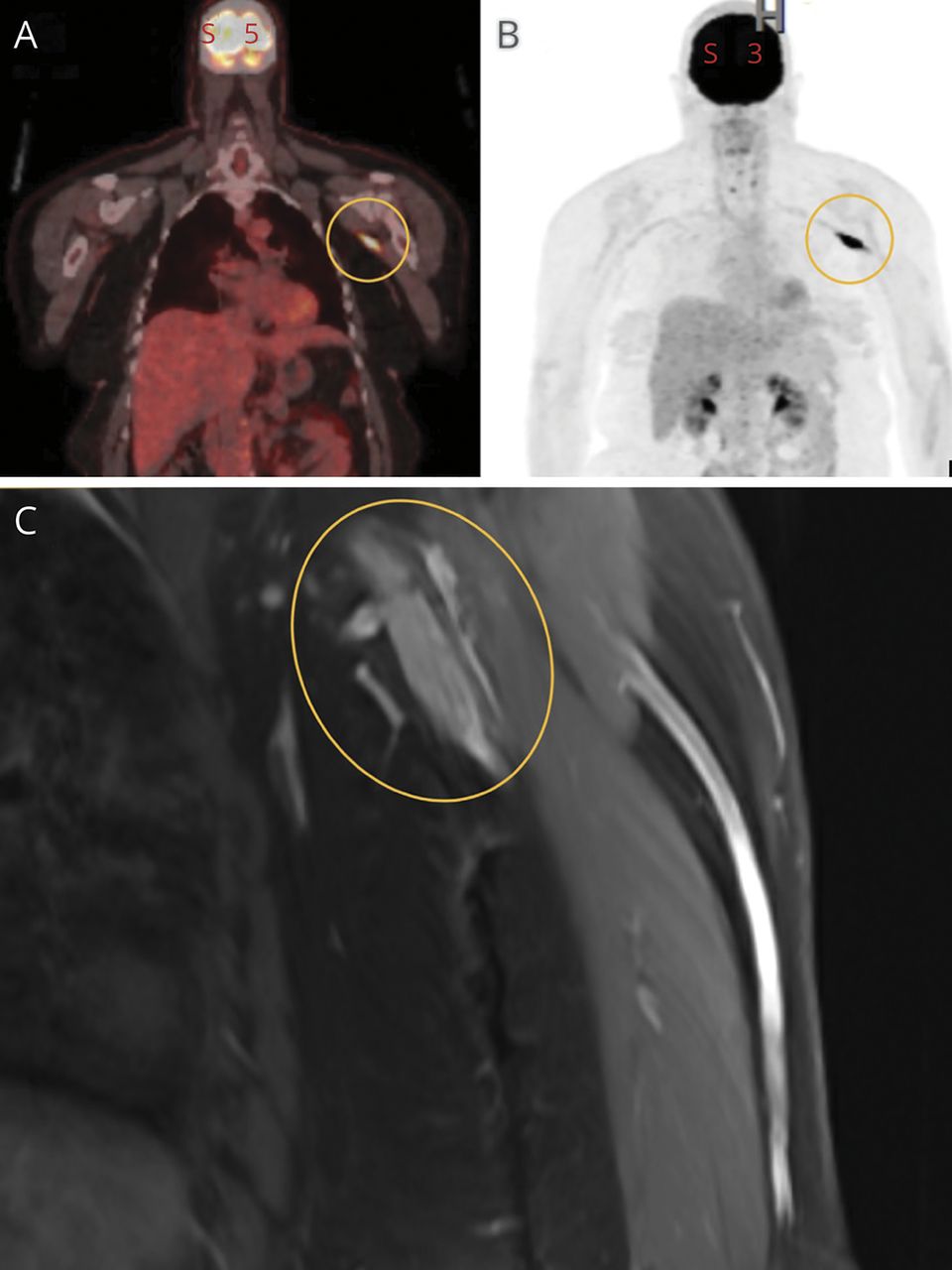 在疑似淋巴瘤的患者中,腋窝淋巴结或沿神经走行局灶性氟脱氧葡萄糖(FDG)摄取提示肿瘤病因。低级别弥漫性FDG摄取可见于放射引起的臂丛病或罕见的感染性臂丛炎或血栓形成。