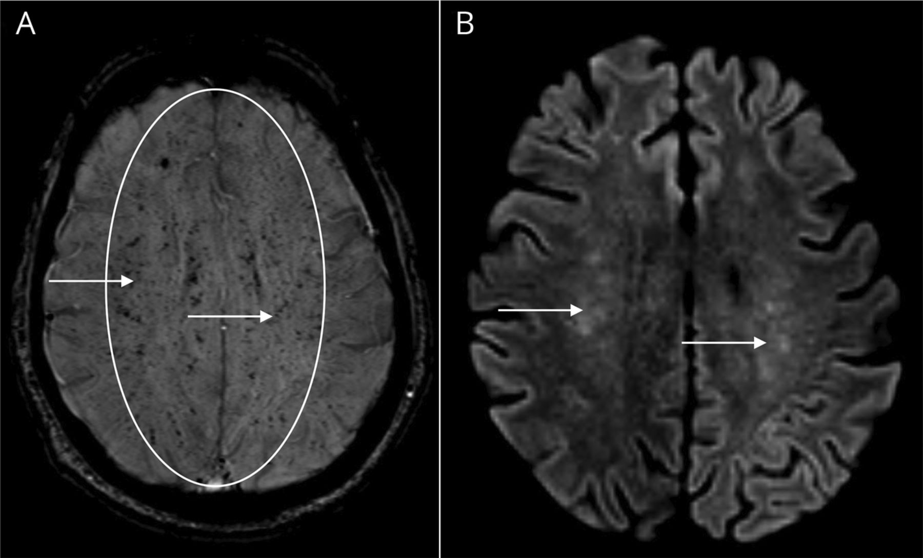 (一)瑞士核桃仁的皮质下区域中的多个hypointensities模式。(B)与星际模式多种hyperintense醉酒驾车,片状双边深度和皮层下白质病变。醉酒驾车= diffusion-weighted成像;瑞士= susceptibility-weighted成像。