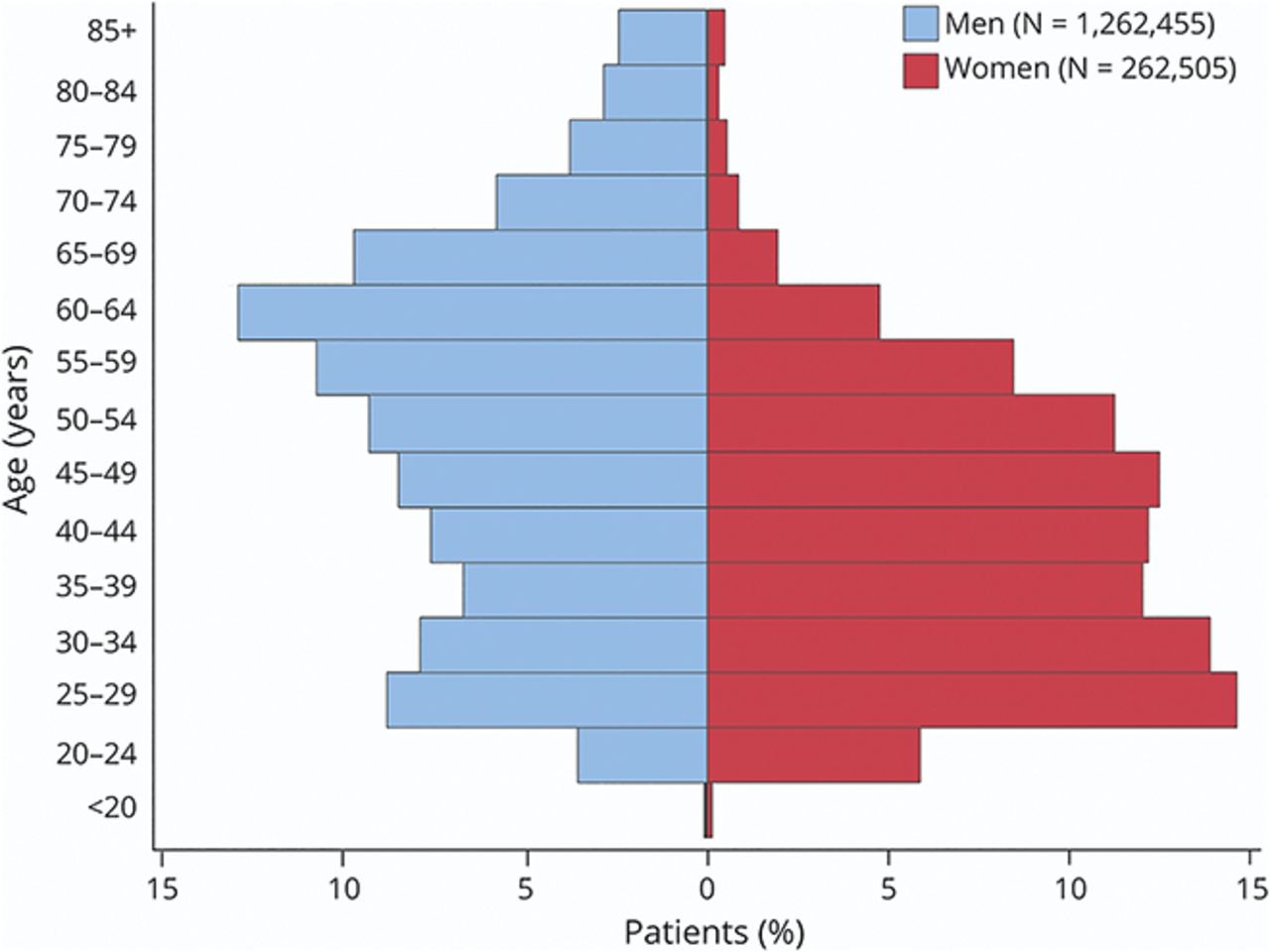 总共有1150万退伍军人服役的VHA 12年的观察覆盖的头痛队列;7.4%的人是女性。VHA的HCoE行政数据队列包括1524960名不同的退伍军人医学诊断为任何类型的头痛在至少1门诊访问(头痛共有820万人次)在2008财年和2019财年(表1)。女性由年轻群体的17.2%,明显(41.9 vs 52.0年),更多的非白人(43.3% vs 29.6%),和未婚(62.7% vs 43.4%),与之相比,男性。女性越来越多的退伍军人在最近的军事行动时代;四分之三的女性退伍军人服役后越南相比,45.6%的男性退伍军人。双峰年龄分布的第一个头痛的诊断是男性所指出的,而一个峰值25 - 29岁妇女指出(图1)。关于事件/条件VHA的高利息,头痛的男性会有临床显著更高的利率的超重/肥胖(81.0% vs 74.3%),创伤性脑损伤(2.9% vs 1.1%),创伤后应激障碍(23.7% vs 21.7%)和低利率的MST (3.2% vs 33.7%)。