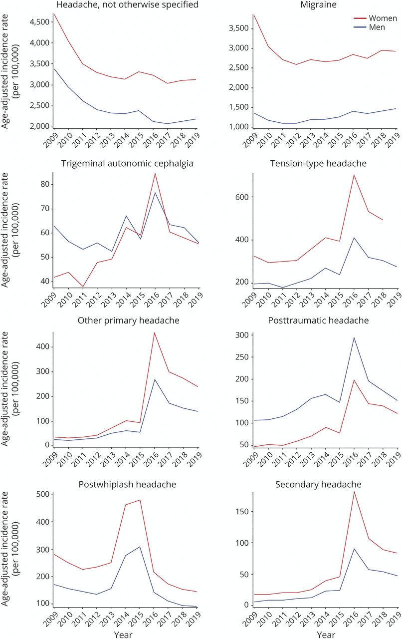 方法本研究采用回顾性队列设计检查VHA电子健康记录(EHR)数据。这个群体包括退伍军人之间至少有1访问任何头痛财政年2008年和2019年。头痛诊断分为8类使用国际疾病分类、临床修改代码。人口、军事相关风险敞口、并发症和类型的提供者(s)咨询被性别从电子健康档案中提取和比较。年龄调整医学诊断头痛疾患的发病率和患病率分别计算每种类型的头痛。