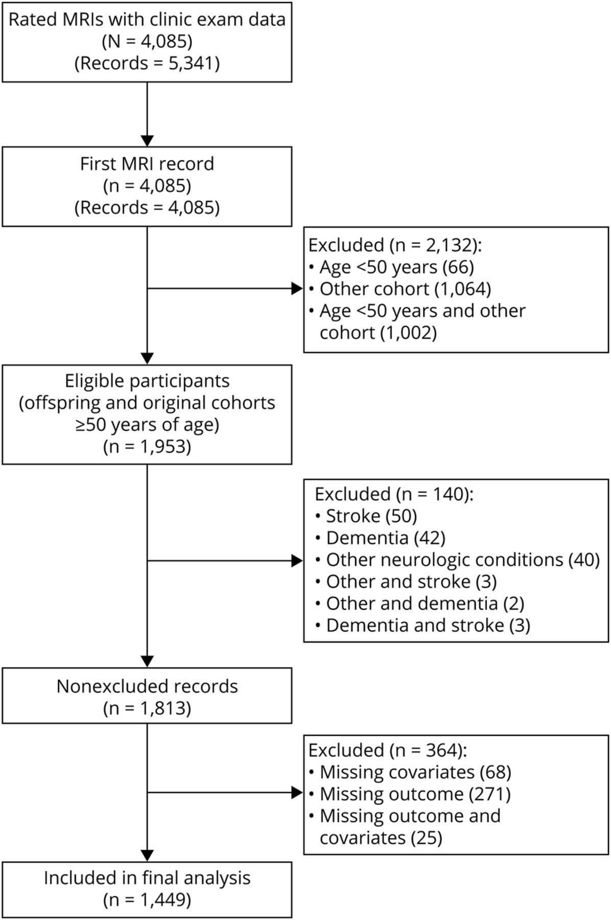 总共有5341 pv评价MRI记录从4085年FHS参与者用相应的临床检查数据。受试者有不止一个pv评级,我们使用第一个可用的记录。4085人,1953人从原始和后代群体,年龄超过50岁的MRI扫描。一百四十名参与者被排除在外,因为普遍中风或痴呆或其他神经系统疾病,和一个额外的364名参与者被排除在外,因为丢失的结果或协变量数据,产生1449名参与者的研究样本。样本选择所示图1。
