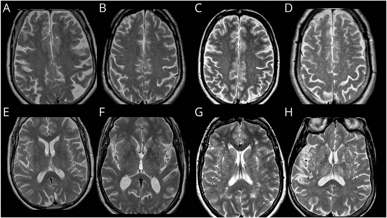 行椎体上部semiovale: (A)年级我(1 - 10 pv数),(B)二级(11日至20日pv数),(C)三级(意向pv数)和(D)年级第四(> 40 pv数)。底下一行基底神经节区:我(E)年级(1 - 10 pv数),(F)二级(11日至20日pv数),(G)三级(意向pv数)和(H)等级IV (> 40 pv数)。pv =血管周的空间,FHS =弗雷明汉心脏研究。