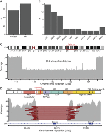 使用ClinSV,29我们还能够检测到CNVs和SVs,包括染色体4q26-q28.3的一种新的杂合16.4 Mb重新缺失(图3 c),先证者表现为癫痫发作、眼下垂、视神经萎缩、共济失调、肌病、糖尿病和复发性假性肠梗阻(患者B3,表3,links.lww.com/WNL/C92).缺失的基因包括PRSS12(智力发育障碍,常染色体隐性遗传1,孟德尔遗传在人[MIM] 249500),MRT29(智力发育障碍,常染色体隐性29,MIM 614333),以及SPATA5(癫痫、听力损失和神经发育障碍,MIM 616577),在交替等位基因上没有可检测到的致病变异。这一发现通过比较基因组杂交阵列得到证实,在先证者的父母中不存在。我们还检测到一个纯合外显子6缺失SPG7(图3 d一例痉挛性截瘫并发小脑性共济失调、眼肌麻痹和感觉神经病变的先证者(患者E75,表3)。