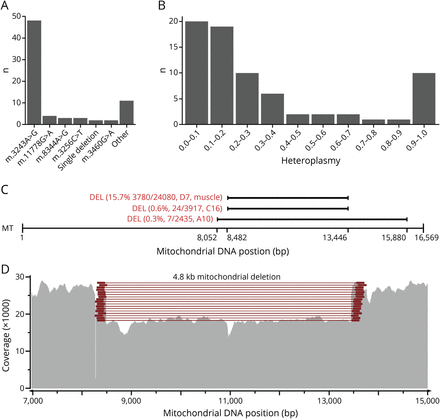 (A) WGS检测到的致病mtDNA变异数量和(B)相应的变异异质性。(C)血液中发现了两个线粒体DNA单缺失,均在1%以下的异质性。尸检肌肉中发现了一个线粒体缺失,异质性更高,为15.7%,在(D)中更详细地显示,这突出了测序覆盖率和跨越缺失的reads。mtDNA =线粒体DNA;全基因组测序。