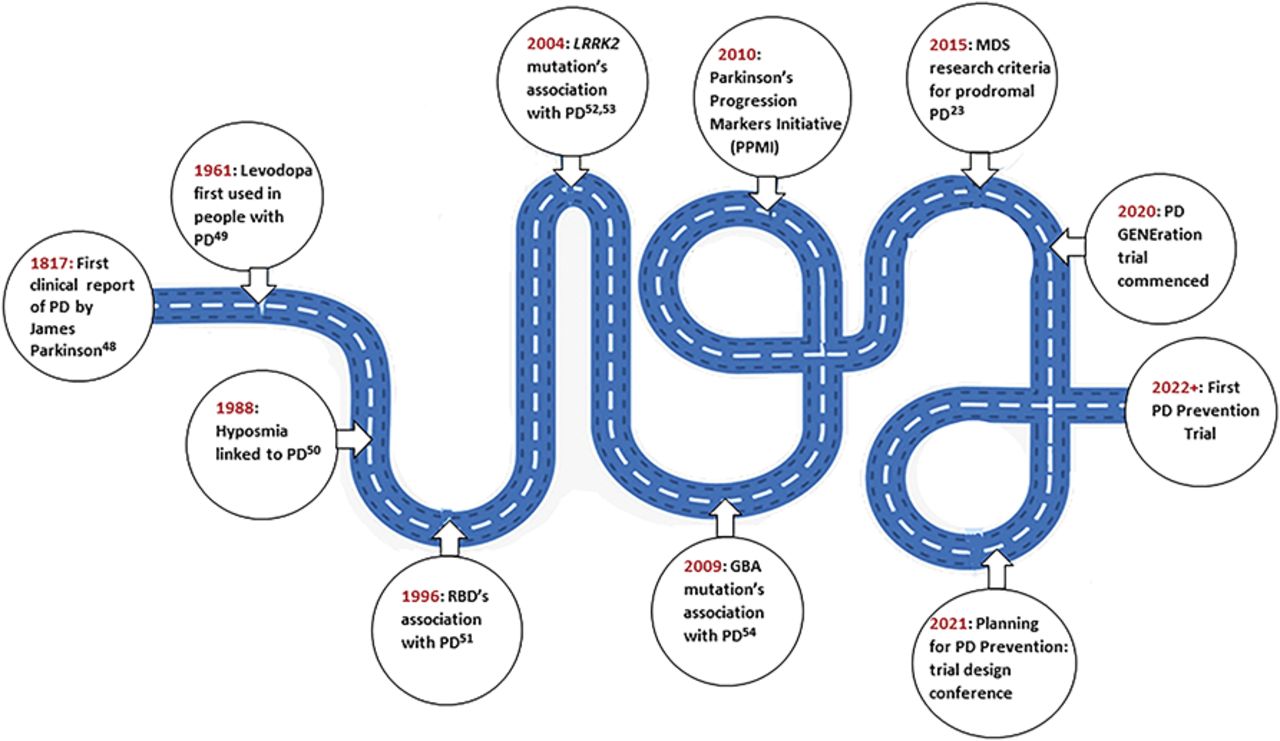 这个路线图顺序凸显了PD的许多发现和创新研究,带头第一个PD预防试验设计和实现。23,48,- - - - - -,54MDS =社会运动障碍;PD =帕金森病。