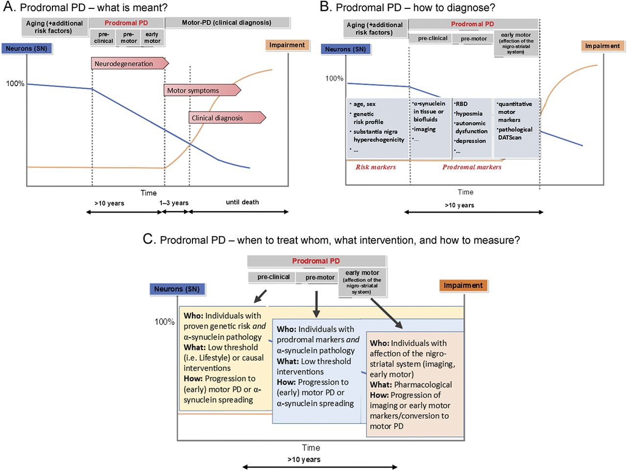 (A)给出了原理的概述我们当前神经退化过程的理解在PD和说明前驱的阶段可以分为三个阶段。值得注意的是,这些都是假设的框架——特定元素代表和指定的时间段内没有证实。这些阶段不需要明显的个人,可能有不同的时间,甚至可以同时发生(例如,个人有轻度运动异常可能会同时hyposmic电机成为显而易见的变化)。(B),标记的特定阶段。(C)提供了特定人群的例子(谁?)依赖于临床试验阶段和相应的标记。药理学试验在所有军团只能证明当PD-specific病理学证明证明α-synuclein病理学或参与黑系统(早期的汽车)。相反,低门槛干预(如运动)可以应用于所有阶段即使病理不能证明。干预的选择(什么?)可能不同,这取决于临床亚型(谁?)的特异性生物标志物,端点为临床研究(如何吗?)。PD =帕金森病;SN =黑质。