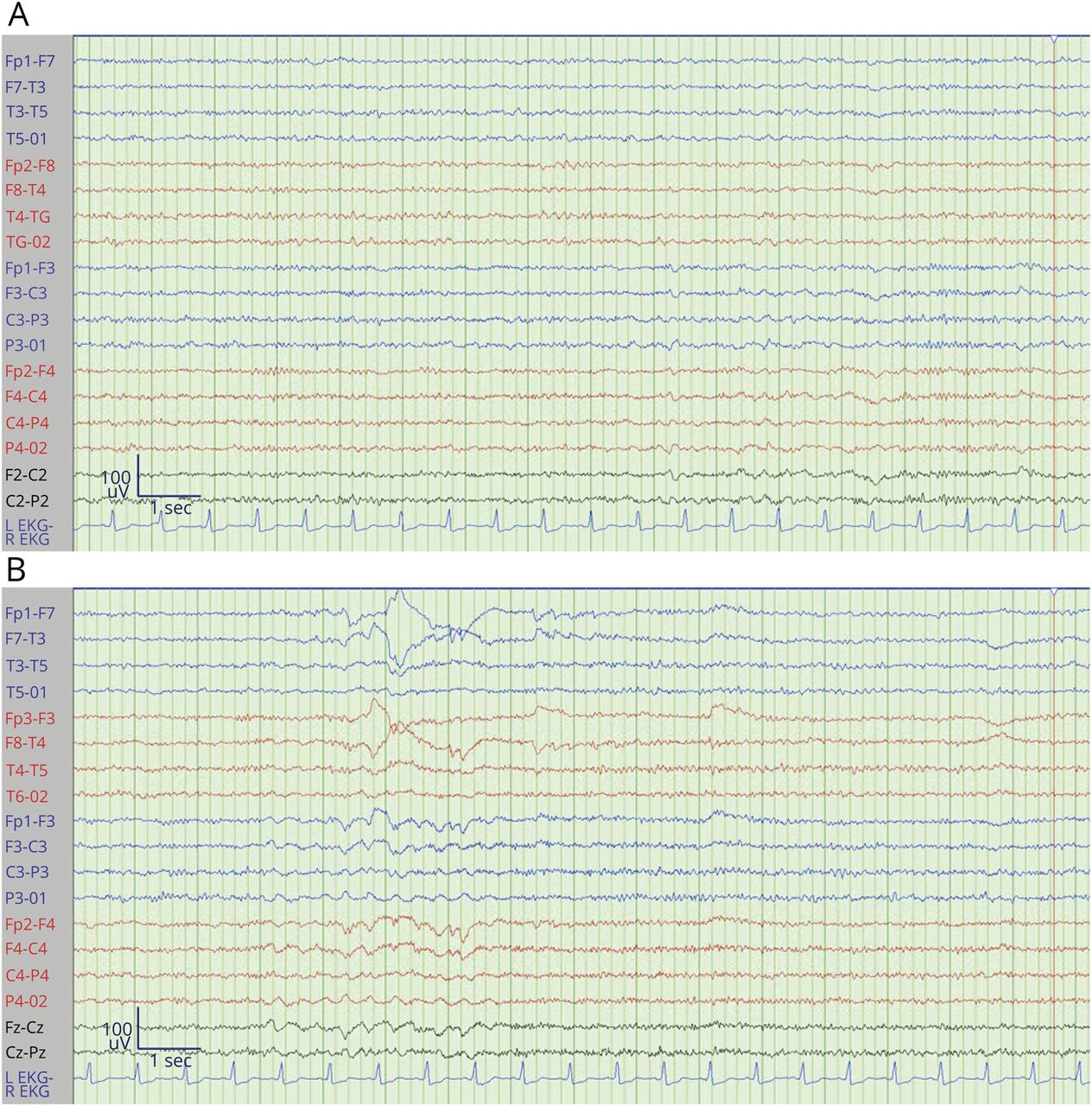(一)脑电图样本与正常睡眠纺锤波N2阶段睡眠。(B)在连续的第二个页面,有一阵高烈度侧眼球运动与并发锯齿波,表明快速眼动。还要注意肌肉静止。这种影响快速眼动期可能被误解为锋利的波浪。