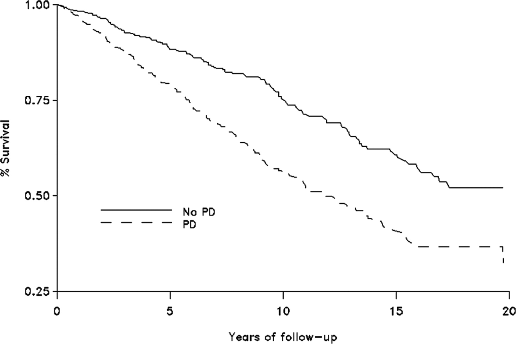 三百三十人死在一个平均5.8年的随访,(范围0.1 - -22.9年),PD组中200例(35.7%)和130年(23.2%),参照群体。PD组的生存中值是11.8年和20.0年的参照群体。平均死亡年龄为82.2岁PD患者和85.3年引用主题。kaplan meier曲线整体生存中显示图1显示了PD组的死亡风险增加(log-rankp< 0.0001)。死于任何原因的原油人力资源为2.05 (95% CI 1.64 - -2.56), smoking-adjusted人力资源为2.10 (95% CI 1.68 - -2.62),和年龄,smoking-adjusted人力资源为2.32 (95% CI 1.85 - -2.92)。进一步调整了其他潜在的混杂因素没有改变人力资源。
