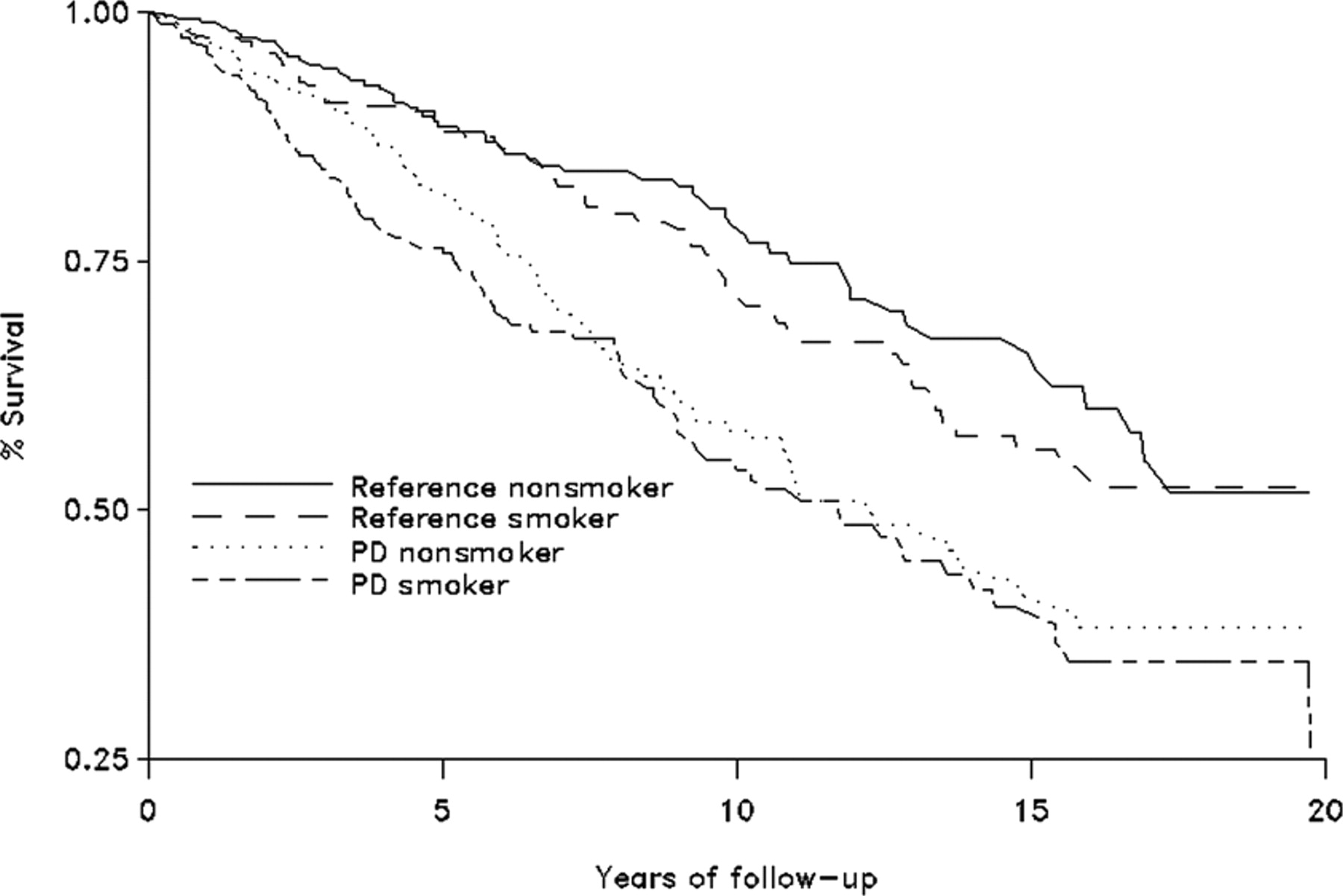 当疾病的持续时间,进行分层分析,有一个稳定的PD患者死亡的风险增加。风险是目前即使在那些有疾病的持续时间小于2年(HR = 2.00;95%可信区间1.03 - -3.88)。最后,吸烟状态没有修改PD和死亡率之间的关系(p交互= 0.87)。图2显示结果的生存分析分层PD和吸烟状况。