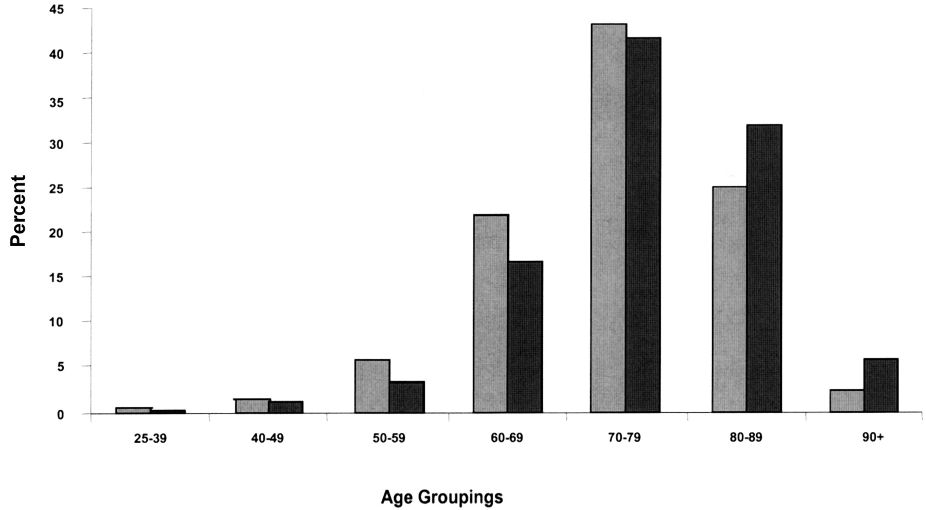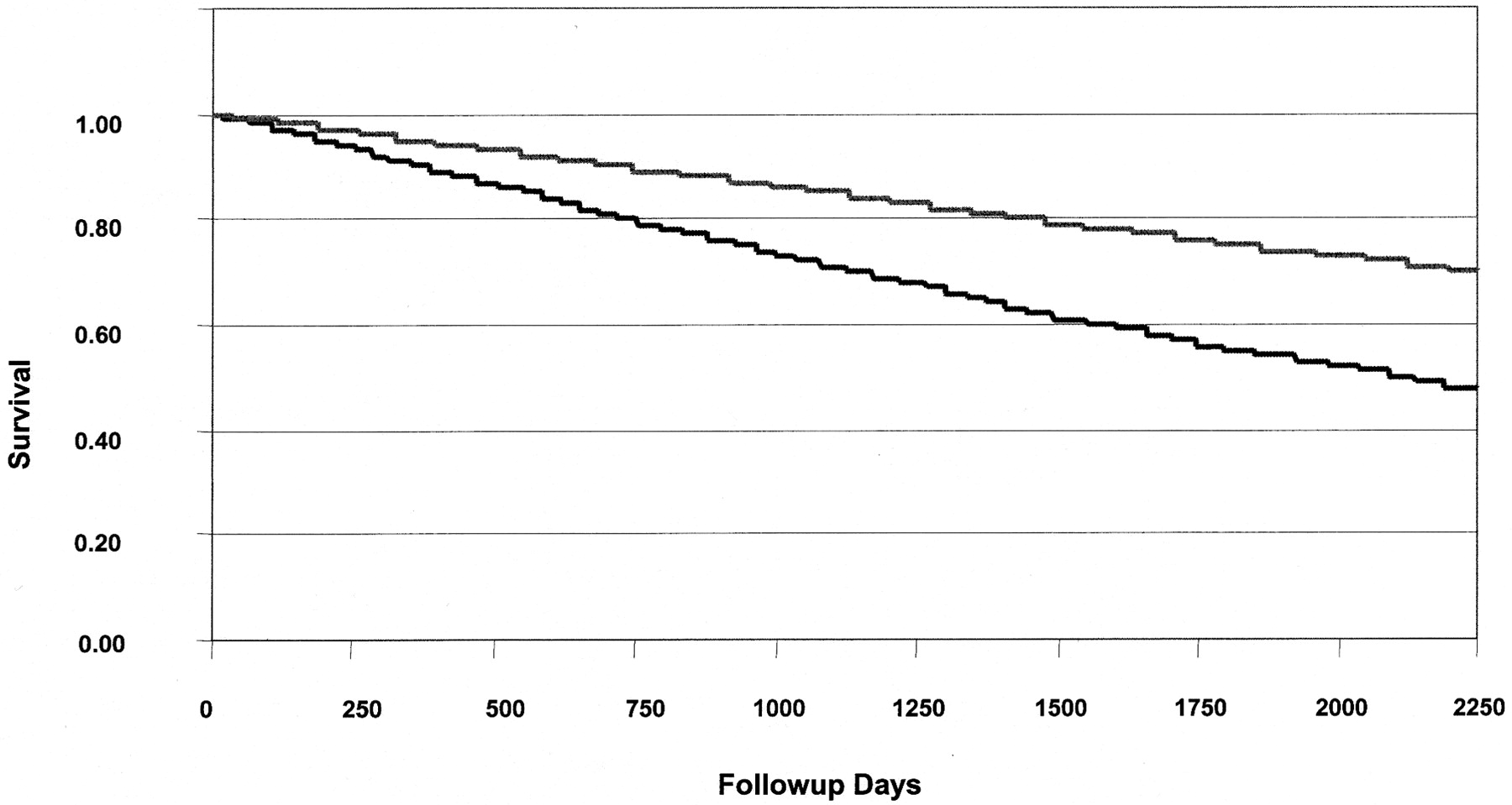 的年龄和性别分布PKM组可见图1。的表显示了PKM病例和对照组死亡率在六年期间的研究。死亡率在11例(50.8%)与对照组相比显著增加(29.1%),以1.75的相对风险。生存曲线的11例和控制所示图2。这显示了PKM的大幅度增加的死亡率在6例与对照组相比。