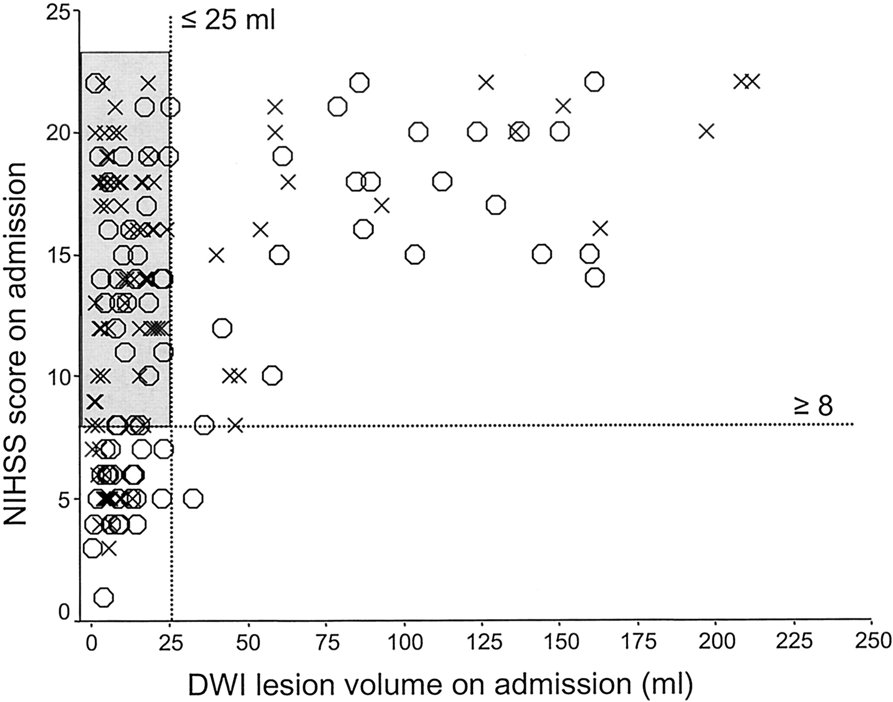 CDM是定义为一个署得分≥8和缺血性成交量驾车≤25毫升的承认。署评分≥8一直与神经功能恶化率高,低频率的自发的功能恢复,和皮质灌注赤字在以前的报告。7、10⇓所以,我们使用这个分界点作为间接临床大量缺血性脑组织的迹象。的探索性posthoc分析数据显示,几乎所有患者署得分< 8有醉酒驾车损伤量≤25毫升(图1)。因此,我们使用这个体积分界点说明组织之间的不匹配可能会不可逆转受损,临床中风的严重程度的大小。