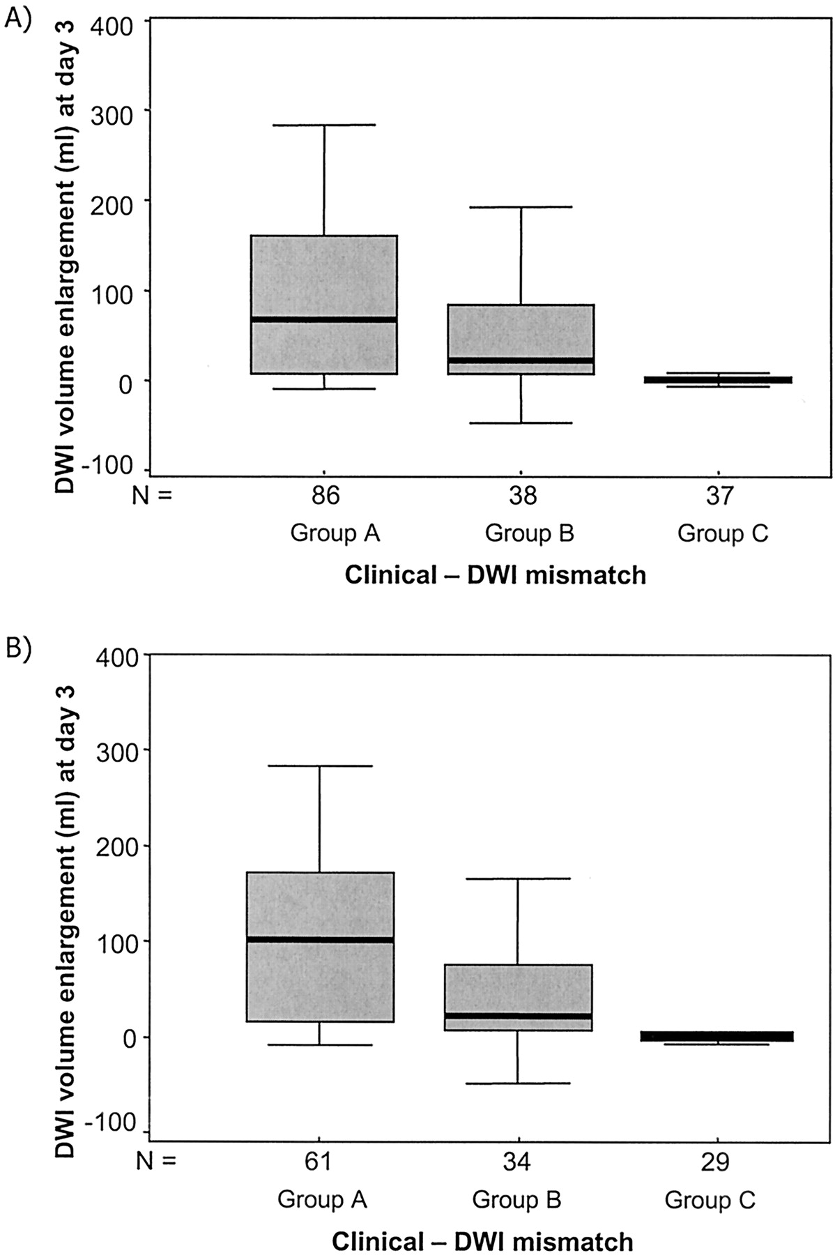 图2。箱线图显示值中位数(水平线在盒子里面),四分位数(盒子边界),和观察到的最大和最小值(来自盒子的结束行)。Diffusion-weighted成像(驾车)病灶体积扩大天0和3 clinical-DWI患者之间不匹配(A组)和在病人没有因为醉酒驾车> 25毫升(B组)或NIH卒中量表评分< 8入院时(C组)全系列(A) (p< 0.001),患者没有接受再灌注疗法(B) (p< 0.001)。