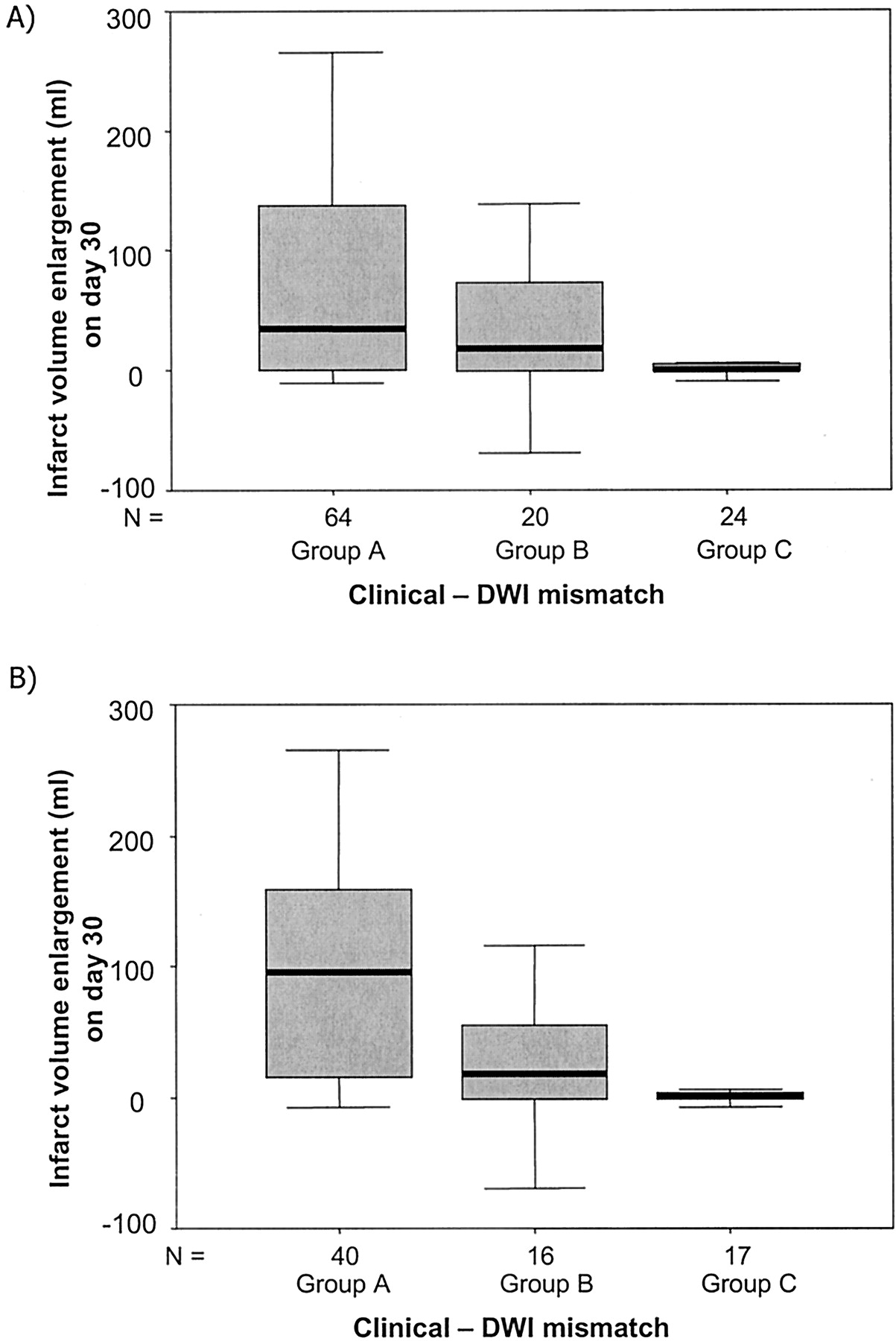 图3。箱线图显示值中位数(水平线在盒子里面),四分位数(盒子边界),和观察到的最大和最小值(来自盒子的结束行)。梗塞体积增大之间diffusion-weighted 0和t2加权成像(驾车)天或fluid-attenuated反转恢复成像患者在30天clinical-DWI不匹配(A组)和在病人没有因为醉酒驾车> 25毫升(B组)或NIH卒中量表评分< 8入院时(C组)全系列(A) (p< 0.001),患者没有接受再灌注疗法(B) (p< 0.001)。