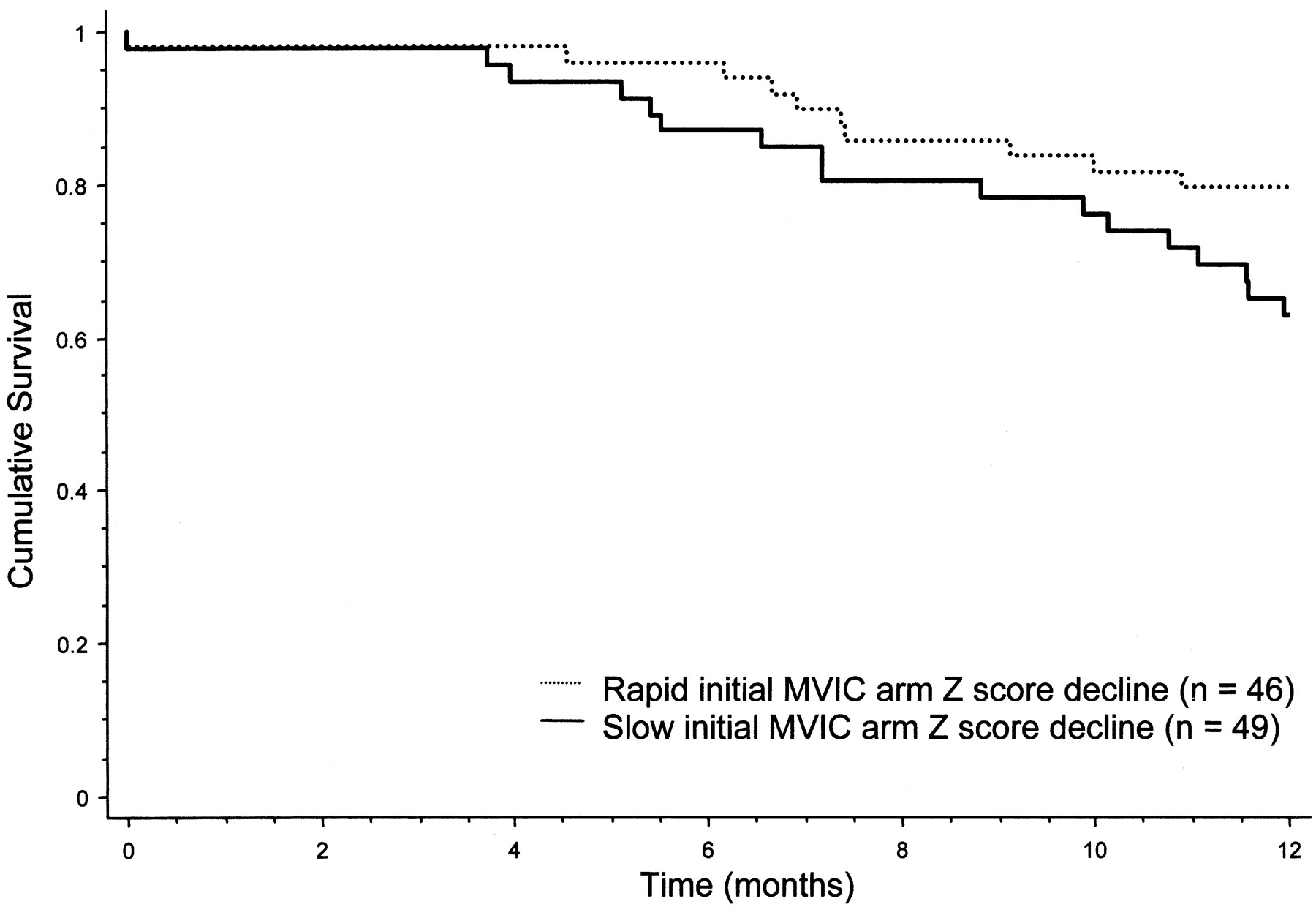 ALSFRS和FVC %相比,初始速率下降的病人的MVIC-arm MVIC-grip Z分数并没有预测生存在研究期间。患者分为两组根据MVIC Z分数的下降速度是否在第一个三个月的研究是大于或小于中位数,下降的速度(即。,每月0.09手臂力量和握力每月1.10)。的年死亡率ALS患者的初始速率较慢,MVIC-arm和MVIC-grip Z分数下降了19%,23%,36%和32%的患者更高的初始速率的下降。此外,曲线并没有统计上的不同(图2看看图上飞行首页网站;log-rankp= 0.09和0.49)。