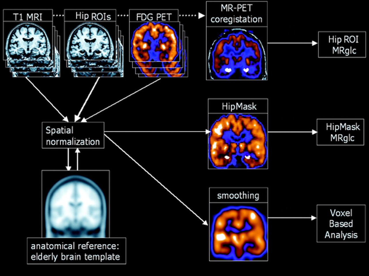 大部分代谢神经影像学研究矛盾的建议没有海马功能障碍在阿尔茨海默病(AD)和轻度认知障碍(MCI)。超过200个研究用宠物2 - (18F] fluoro-2-deoxy-d-glucose (FDG)展示了减少葡萄糖代谢异常(MRglc)在大型皮质区域,1 - 5而只有五个报道海马异常在广告或MCI的证据。6 - 10海马代谢减退的发现完全来自正研究用手动的(ROI)抽样法由coregistered MRI引导的生活。6 - 10另一方面,未能观察海马的影响是一致的特征,这些正研究用自动分布分析(VBA)。VBA主要是用于方便的图像分析和统计检验组的差异。VBA依靠完全自动化的图像配准和大小归一化协议标准化所有大脑一个共同的空间,使PET扫描voxel-wise基础上的评估。11 - 13我们假设的VBA阴性结果是由于失败的相对较小的空间排列结构像海马体容易高与衰老和神经退行性变的解剖变异。