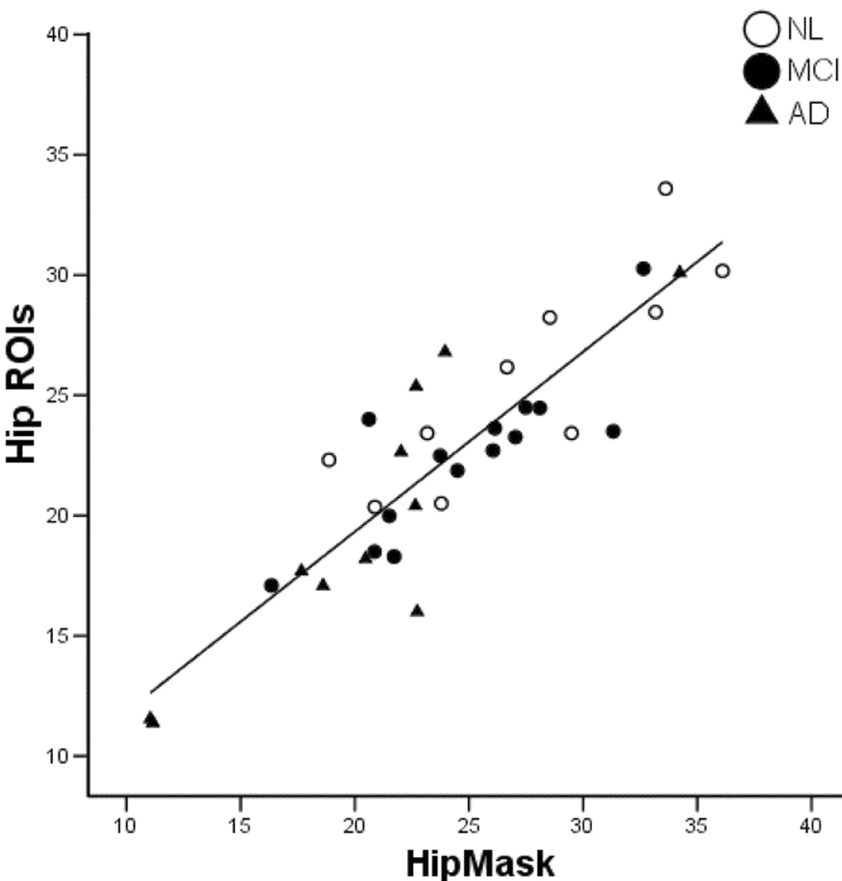 图3。海马之间的相关性与non-corrected MRglc数据提取感兴趣的区域从MRI-coregistered PET扫描和HipMask空间标准化的PET扫描(r = 0.89,p <0.001)。健康老人=白圈;轻度认知障碍=黑圈;阿尔茨海默病=三角形。