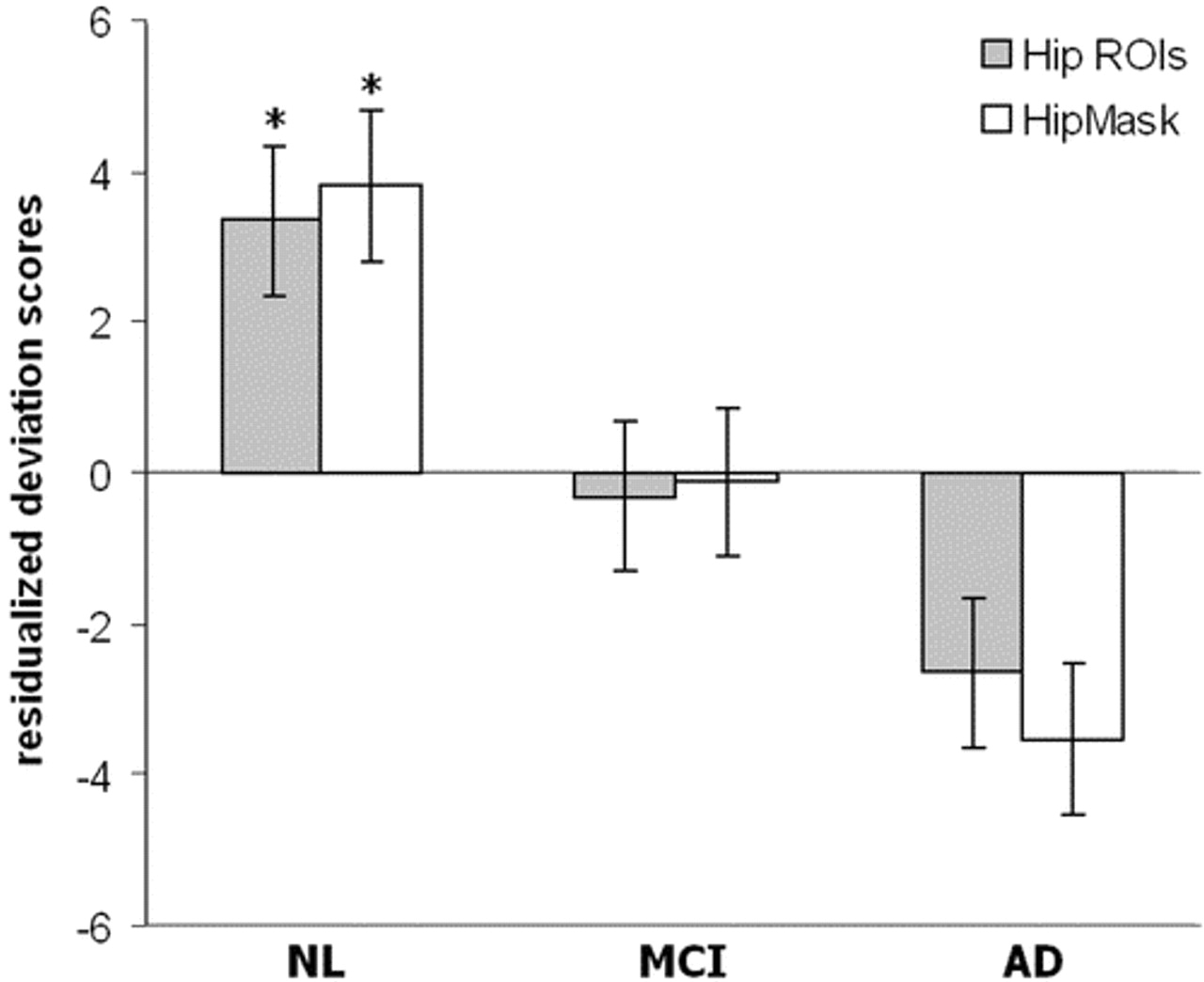 图4。海马体MRglc差异对健康老年人(NL),轻度认知障碍(MCI)和阿尔茨海默病(AD)大的意思是,在控制了年龄,性别和脑桥新陈代谢。海马MRglc减少被发现为MCI (p <0.05)和广告(p <0.001)组相对于本地语言使用感兴趣的区域(灰色)或HipMask(白色)技术。