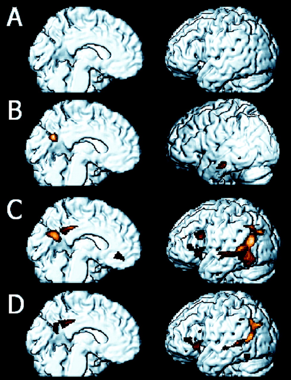 图5。结果与SPM99分布分析。(一)没有MRglc健康老人之间的差异被发现(NL)和轻度认知障碍(MCI)p <0.05纠正为多个比较。(B)通过重置概率阈值的限制较少的价值p <0.001、未修正的两个集群MRglc减少被发现的左后扣带(PCC)(图左)和左颞上回(图右)MCI患者相比问。(C)宠物体素显示MRglc削减对阿尔茨海默病(AD)患者与本地语言相比,涉及颞顶、PCC和额叶皮质(p <0.05,为多个比较修正)。(D)宠物体素显示MRglc削减广告相比MCI患者,包括颞顶、PCC和额叶皮质(p <0.05,为多个比较修正)。这种减少区域分布类似于观察广告vs问但是更少空间扩展,表明皮质代谢减退也可能出现在一些MCI患者。领域的代谢减退(代表红黄颜色编码的规模)显示在内侧,外侧的观点volume-rendered空间归一化核磁共振图像。这些大脑区域对应于脑图谱坐标表e 1。