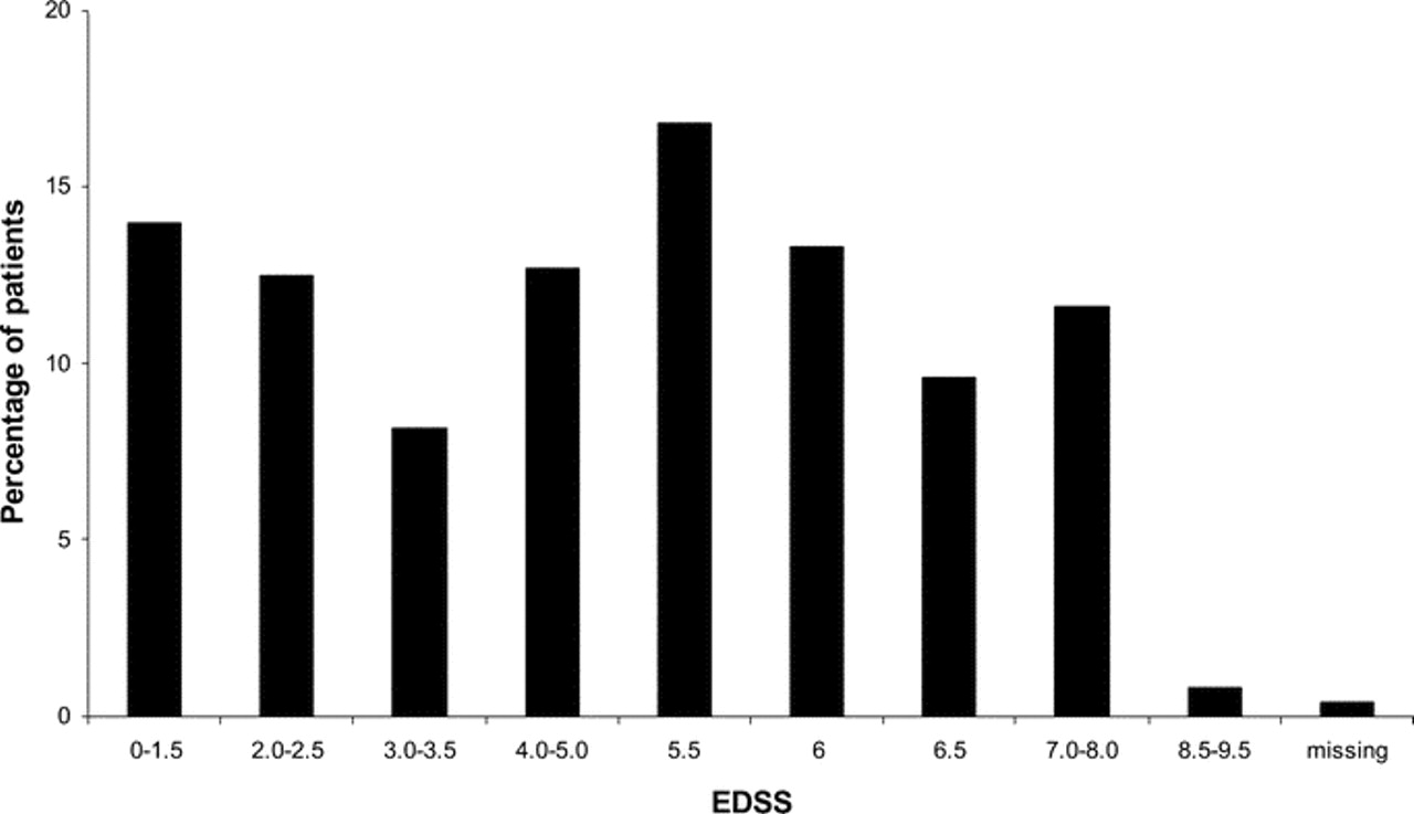 图1所示。比例的患者在不同级别的扩展残疾状态量表(eds) (n = 1909)。更容易理解和其他研究相比,病人疾病步骤确定分数已经改变了eds分数根据作者的原文翻译:0/1 = 1到2.5;2 = 3.0 - 3.5;3 = 4.0 - 5.0;4 = 5.5;5 = 6.0;6 = 6.5;7 = 7.0 - 8.0;8 = 8.5到9.5。