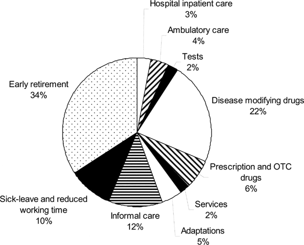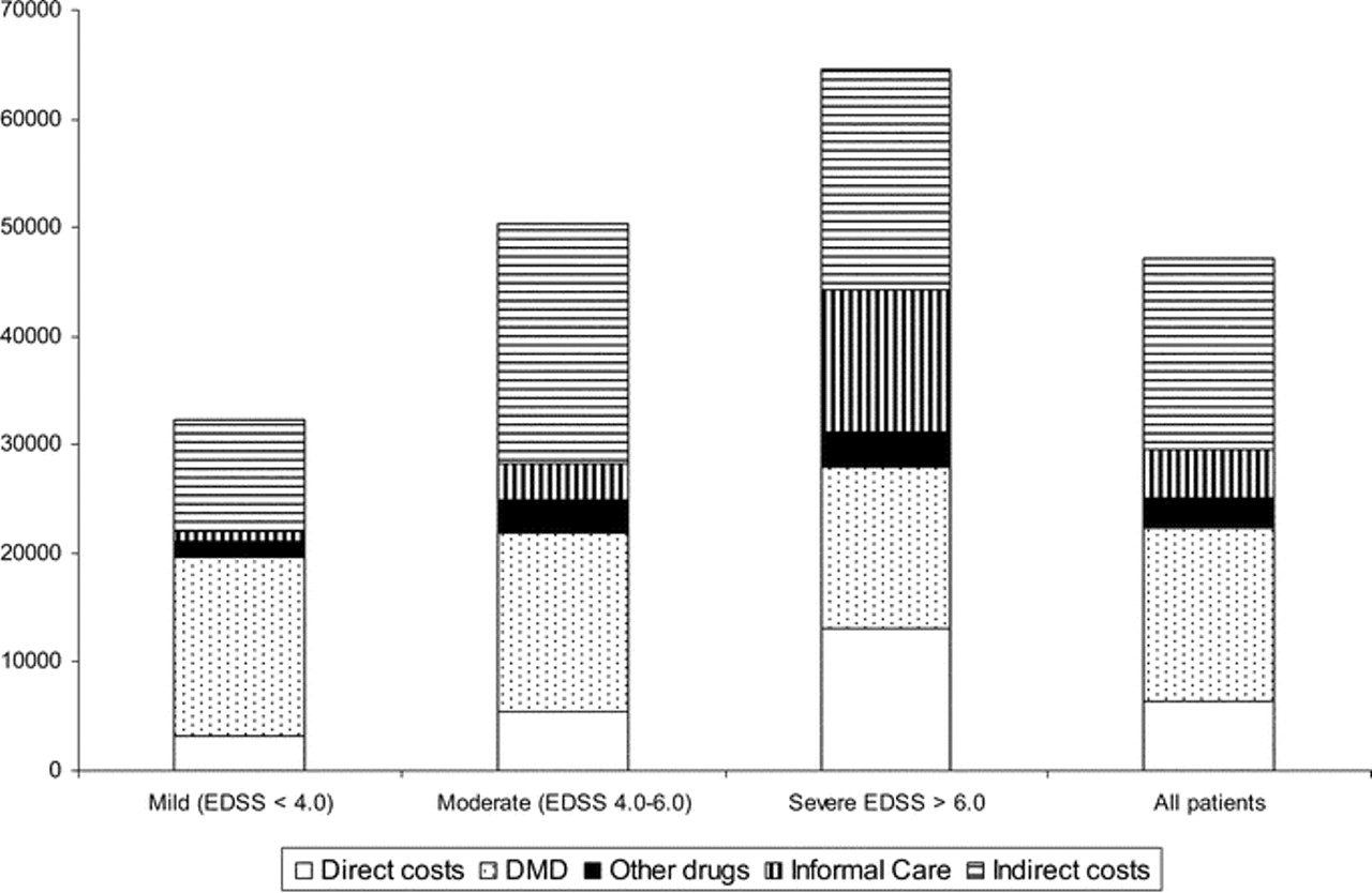 每个病人年平均总成本约为47215美元,其中29634美元或62.8%是直接成本,如所示表2。使用的最大成本的礼物是诊断,几乎所有病人的样本,和长期的生产损失,其次是非正式护理的必要性。住院病人护理是有限的,平均每个病人2天,一年,基本上时间花在疗养院。磋商的成本主要是物理疗法,其次是神经学家,精神病学家和心理学家。测试成本由MRI脑部或脊柱(成本)的69%,在26.7%的样本。除了诊断,77.6%的患者也使用其他处方药,主要是抗抑郁药(52.7%)和anti-spasticity药物(48.5%),其次是抗疲劳药物(38.4%)。非处方药使用除了58.1%的样本。所有使用药物与疾病严重程度相关。服务使用22%样本,由家里的帮助和家庭护理(86%的成本)。投资成本的很大一部分(38%)与运动(汽车修改、轮椅、摩托车)。
