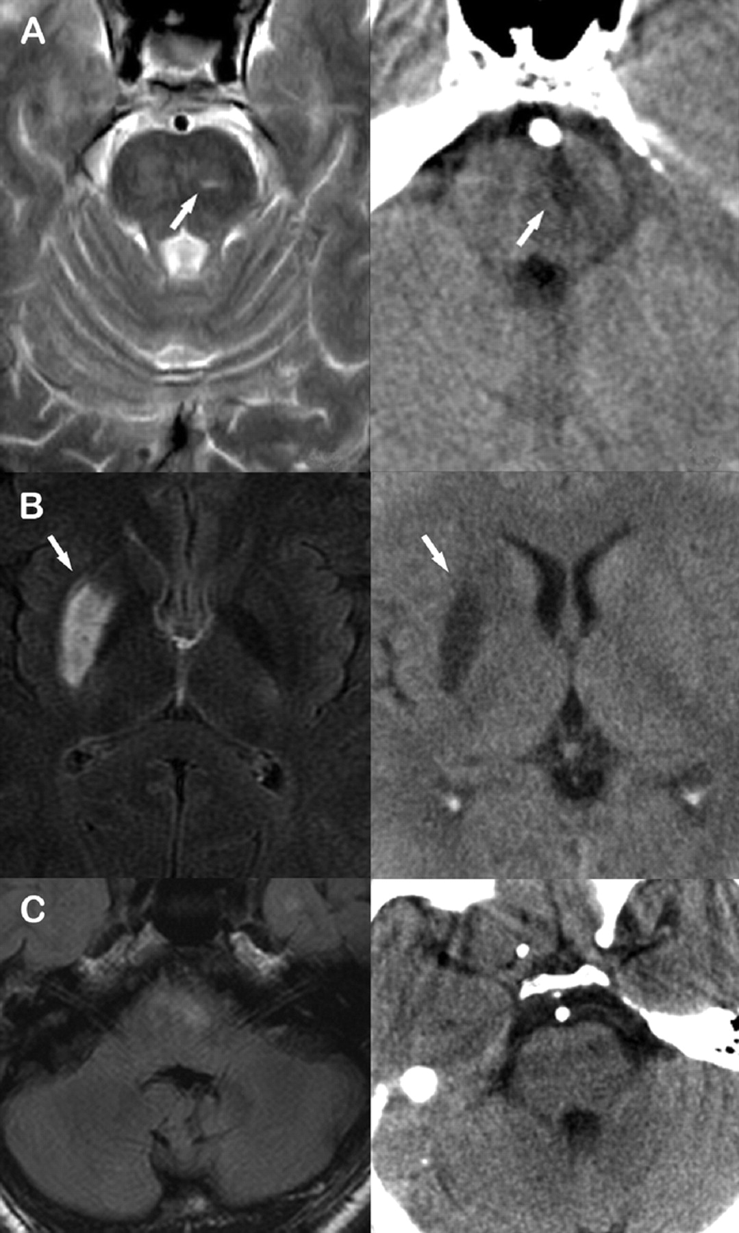 图。(A)案例1:术前先生t2加权成像(图左)显示一个小梗死(箭头)的双侧脑桥的左边区域。重复脑部CT图(右)支架植入后英航狭窄扩大显示桥的梗塞(箭头所指)。(B)案例4:术前先生fluid-attenuated反转恢复(天赋)成像(图左)揭示了权利striato-capsular梗塞(箭头所指)。重复脑部CT图(右)支架植入后对MCA狭窄(解剖)显示一个老梗塞(箭头所指),没有新纹状体外动脉增梗塞在正确的领域。(C)例5:术前天赋先生成像(图左)揭示了梗塞(左>右)双侧面积在脑桥前内侧。重复脑部CT图(右)支架植入后英航狭窄显示梗塞和新老在脑桥梗死。