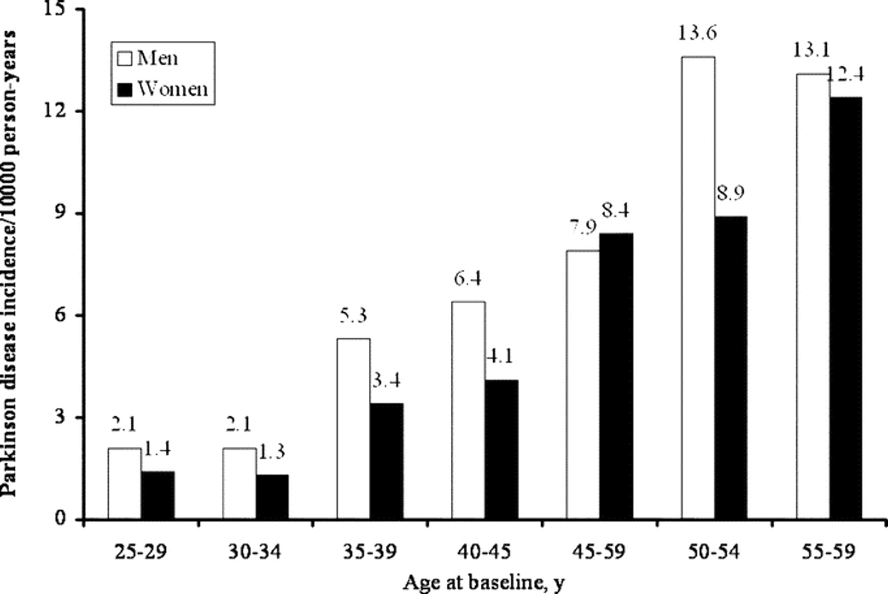 在一个平均18.8年的随访期间,272位男性和254位女性事件PD开发。在诊断时的平均年龄为62.6岁,男性和女性64.3岁。帕金森病发病率男性高于女性,随着年龄的增加(图)。在两种性别中,从来没有和过去吸烟者有一个PD的发生率高于吸烟者在基线。随着体重指数增加,意味着价值的年龄、血压、总胆固醇、和休闲体育活动的患病率增加,而教育水平和饮茶和目前的吸烟的患病率下降(表1)。