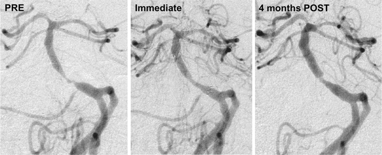 气球放气,另一个血管造影表现。回顾图像后,气球是完全移除,翼展通过网络self-expandable支架系统放在交流导电带长度,集中在病变,并部署缓慢修复稳定器和拔出支架。重复支架动脉的成像和测量残余狭窄进行。