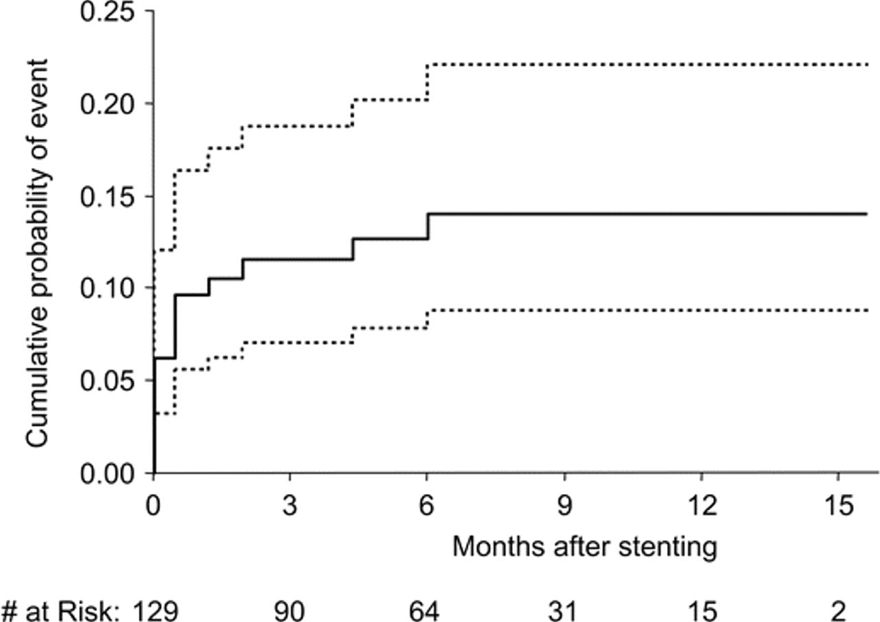 四个额外的缺血性中风的动脉支架后的发生超出30天,一个刚刚超过1个月,2个月,4个月,在6个月。平均时间从30天内支架中风或死亡,中风的动脉支架后的30天之后,或临床随访5.8个月一天15.6个月(范围)。率在30天内的中风或死亡或中风的领土支架后动脉超出30天在6个月是14.0% (95% CI = 8.7%至22.1%,图2)。