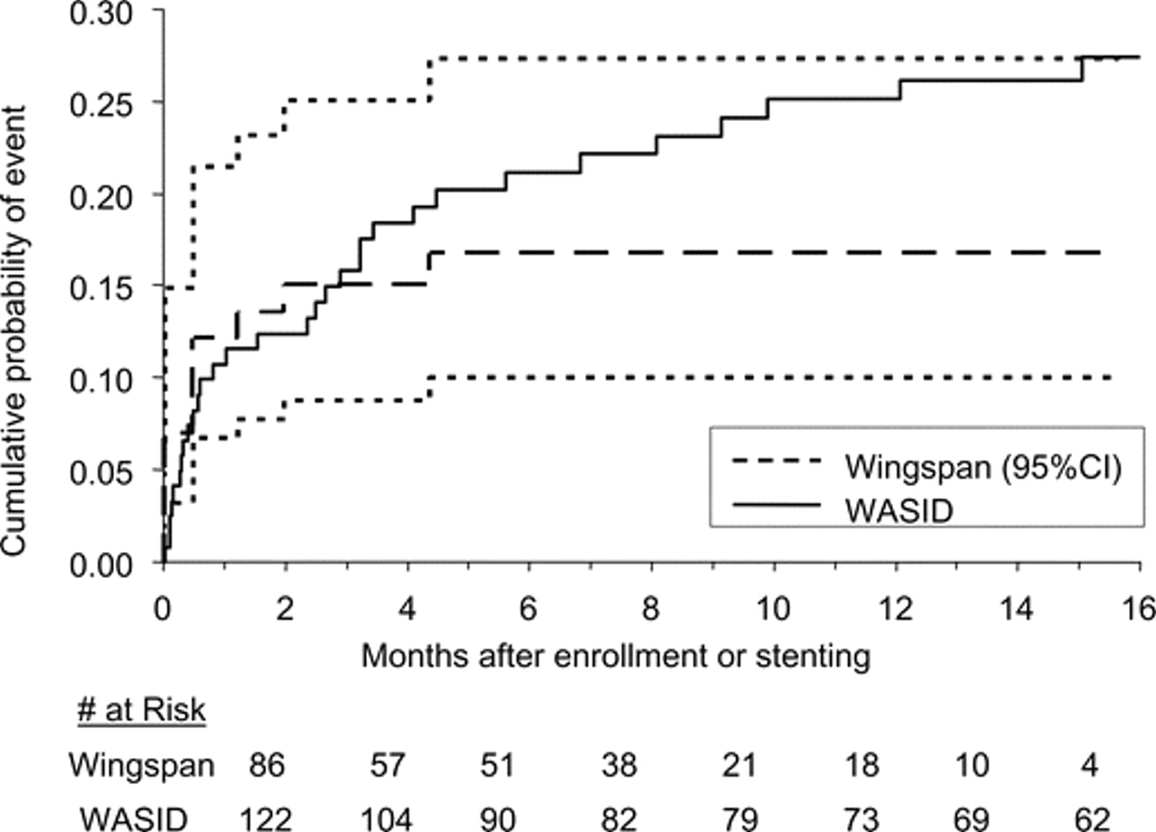 率在30天内的中风或死亡或中风在香港超过30天(预期的主要终点的随机试验支架和药物治疗)是14.0%在6个月,类似于6个月的这个端点WASID患者狭窄70%至99%。9然而,在这个注册表高注册网站,主要终点率在6个月时为9.5%。这个速度类似中风的速率在一项研究中70%到99%的患者狭窄治疗颅内支架在大容量中心在中国。19