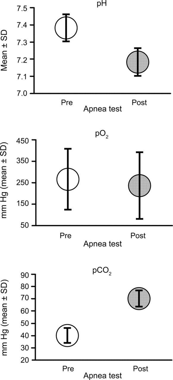 呼吸暂停测试启动后脑干反射缺席。断开从通风机记录2例正常呼吸驱动,但重复呼吸暂停测试12小时和3天后导致呼吸暂停的文档。呼吸暂停测试并不试图在16个病人(7%)。进行呼吸暂停的原因不是测试是无法维持一个稳定的血压(n = 6),高呼气末正压通气的需求(超过15厘米H2O),或难治性低氧血症(n = 10)尽管预备考试氧化试验使用的一小部分灵感氧1 10分钟。的呼吸暂停测试执行与放置气管内抽吸导管提供6到10 L的氧气。在三个实例,一个麻醉包100%的氧气和开放阀5分钟的时间,和一个病人一块T持续气道正压阀15厘米的H2使用O。患者呼吸暂停试验始于212年,但流产7例(3%)与进步的低血压或断开从呼吸机后血氧不足。在剩下的205例,动脉pH值(平均±SD)减少从7.38±0.07,7.18±0.07 (p< 0.001),帕科2从40±5增加到70±9毫米汞柱(p< 0.001),Pao2从265±140毫米汞柱下降236±155毫米汞柱(p< 0.05)(图2)。205年22例(11%),预备考试Pao2边缘,70和100毫米汞柱之间。一个流产患者呼吸暂停试验进行预测Pao吗270和100毫米汞柱之间的值通常比患者呼吸暂停测试完成,但是差异没有统计学上不同(28% vs 8%;Fisher精确检验p= 0.12)。短暂的低血压(收缩压在75和90毫米汞柱)的完成呼吸暂停试验指出在14个病人(7%)。血氧不足(Pao233至60毫米汞柱)记录在测验后的血气在10个病人。心律失常或心脏骤停没有被观察到。所有的患者气胸。成功完成呼吸暂停测试不是由肺异常预测或胸管放置。创伤性脑损伤患者多发伤患者是更常见的流产或不尝试比患者呼吸暂停测试完成测试(15/23,65% vs 59/205, 29%;χ212.52测试,p= 0.0004)。