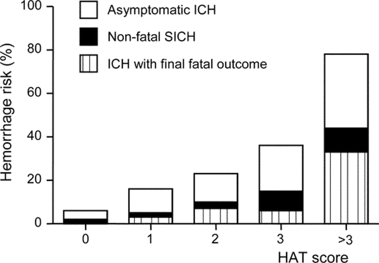 元素的帽子在患者危险分层分数是可靠的。每个组件的规模已报告的独立预测指标后西奇t-PA AIS的各种调查和在不同人群。1、3、4 - 6、8、10、12、13所示署分数被广泛用于评估临床中风的严重程度。严重程度与风险增加相关的初始临床赤字t-PA后我在欧洲合作急性中风的研究。6高署的体积分数被认为与缺血性组织出血性转化的风险。3、5、13的存在和程度可见hypodensity基线CT,被认为是细胞毒性水肿和可能的发展不可逆转的损伤,也被t-PA后与我有关。20.在一项研究中,早期CT hypodensity < 1/3(或3.17)和> MCA领土的三分之一(或9.38)的风险成为t-PA后西奇的独立预测指标。3因为基线署分数和hypodensity在CT扫描的存在和程度绝大多数是与西奇的风险有关,它是合理的权衡他们超过他人,把他们分为三个子目录调整规模连续变化的严重性。葡萄糖会加速血脑屏障破坏增加矩阵metalloproteinase-9表达式。21入院高血糖,尤其是> 200 mg / dL,或发现了糖尿病的重要危险因素西奇在两个注册表。3、5因此,他们被一分为二,以反映协会的力量与出血风险和相应的加权。