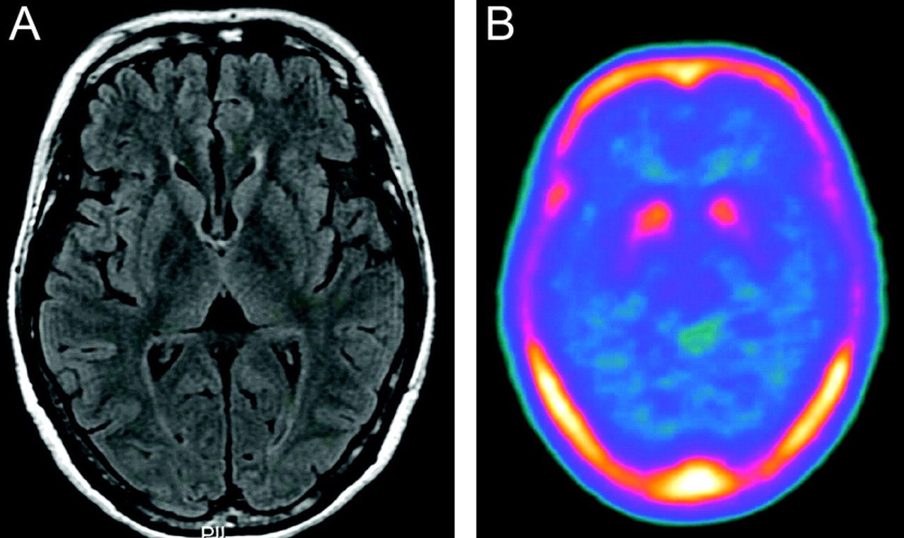 (一)头部MRI显示没有明显的皮质萎缩。(B)18F-dopa PET扫描显示双边下降18F-dopa吸收,特别是左壳,这是兼容的临床症状。