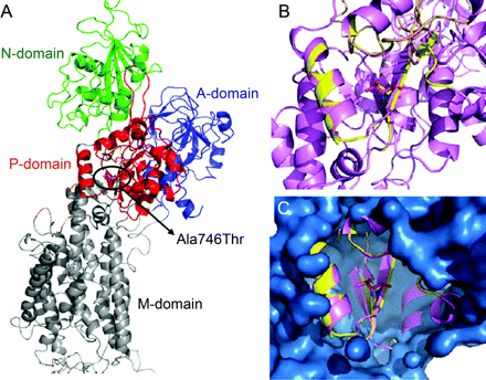 通过使用相对rt - pcr分析,我们发现ATP13A2cDNA表达水平的情况下F37相似年龄/准确性控制主体(图3)。然而,Ala746Thr突变目标P-domain之间的高度保守的区域和M5域(图1 B和3)。虽然没有重大改变的蛋白质三级结构(图4),可能有生化改变的结果替换。