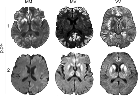 Diffusion-weighted六sCJD各种分子亚型患者的图像显示基底神经节信号增加和信号额增加,时间,和岛叶皮质(MM1);主要的额叶和顶叶皮层信号增加(1/2 MV1);的扣带回皮质hyperintensities、岛叶皮质和海马体(VV1);基底神经节和广泛的皮质hyperintensities(平方毫米);主要的信号增加基底节和丘脑(MV2);和主要基底神经节信号增加,信号增加扣带回(VV2)。发表在的1/2 MV1映像是J Neuroradiol2008;29:1519 - 1524(©2008美国社会的神经放射学;允许转载)。22VV1图像发表在首页河畔65:1544 2005;1550(©2005企业有限公司;允许转载)。15MV2图像发表在是J Neuroradiol2006;27:1459 - 1462(©2006美国社会的神经放射学;允许转载)。23