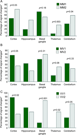 所有分子亚型,VV2病人显示最常见的参与基底节和丘脑。大脑皮层信号增加通常仅限于不到三个区域和最常发现扣带回(表1和2)。
