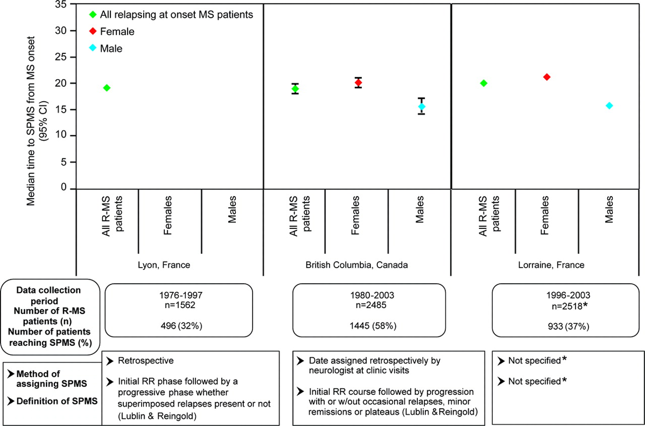 女士是一个出了名的变量疾病;然而,最近的自然历史的研究,使用类似的生存分析技术,再乘以残疾里程碑报告。排名研究按日期顺序(古老的第一,明白了图1),需要拐杖走路的中位时间(扩大残疾状态量表(eds) 6 /残疾状态量表(DSS) 6 /欧洲数据库多发性硬化症损害规模6)范围从15 - 32年。然而,自然历史之间存在异质性的研究设计、数据收集、结果的定义和分析(图1和表1)。使用不同的定义将时间分配给甘蔗(一些需要确认和持续实现DSS / eds 6人)和回顾性与前瞻性任务成绩化合物已经证据确凿的评分者间信eds / DSS的可变性。拟议的颞性别比例和MS发病率的变化3之间也可能影响研究结果的研究,作为一个女士人口的改变配置文件可能导致明显的自然历史的变化。如果更多的女性,因此复发缓和病人提出的比例要大得多,一些研究表明,3那么这可能会导致一个队列,在全球范围内表现出疾病进展缓慢。事实上,不同群体特点,与变化性以及疾病过程(原发性进行性vs relapsing-onset)比率明显(图1)。