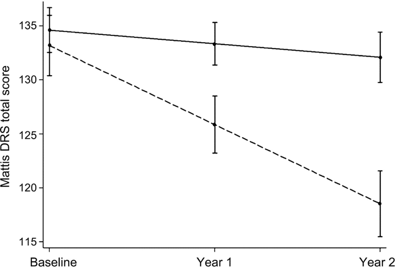 这一分析的时候,45岁受试者至少1年随访的临床评估、20 2后续评估,评价3年后基线。没有失访或撤回同意。整个队列,折合成年率的降幅DRS-2是3.4分(±0.96)。基线人口统计学特征所示表1。