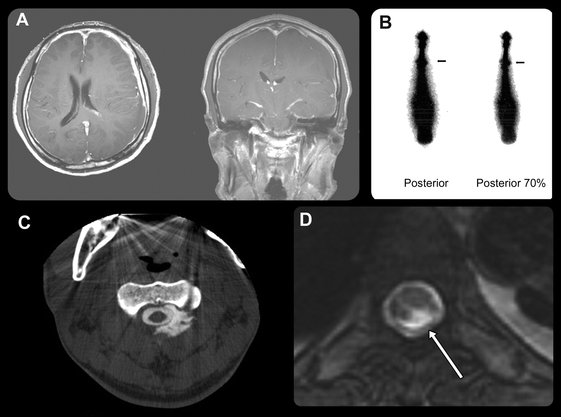 56例(23男人和33个女人;平均年龄39.6岁;范围22 - 69年)被纳入本研究。临床上,55例(98.2%)显示直立性头痛发作的症状。其他硅的表现包括恶心,呕吐,颈部僵硬、耳鸣、视力模糊、复视、精神状态改变。在所有患者脑部MRI进行早期诊断。扩散pachymeningeal增强脑部MRI是最常见的发现,并在48例。然而,8例没有pachymeningeal增强明显。硬脑膜下血肿被发现在13个患者和18例观察扁桃体的向下位移。12例MRI显示一个删除prepontine水箱。 Spinal MRI was performed in 27 patients, CT myelography in 19, and radioisotope cisternography in 33. Spinal neuroimaging such as whole spine MRI including fat-suppression images or CT myelography and radioisotope cisternography revealed a spinal CSF leak site in 37 of 56 patients (图1)。脑脊液漏的位置如下:颈,6例;cervico-thoracic, 15;midlower胸,8;腰,10;和未知,17 (表1)。由于质量效应,8慢性硬膜下血肿患者接受了毛刺和排水洞环钻术。