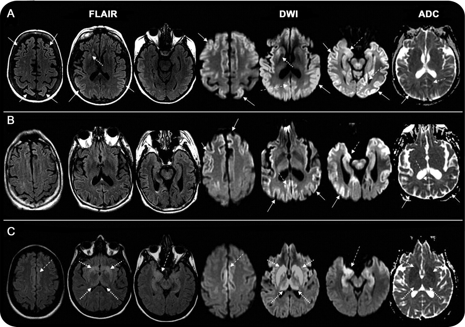 (一)皮层(实心箭头),边缘(虚线箭头),皮层下灰质(虚线箭头)。(B)皮层和边缘皮层。(C)边缘和皮层下。注意diffusion-weighted成像(驾车)显示了hyperintensities比相应的fluid-attenuated反转恢复序列(天赋),而醉酒驾车hyperintensities通常都有相应的表观扩散系数(ADC) hypointensity。模式被发现在54%的情况下,模式B在27%的情况下,和模式C在9%的情况下。注意,异常更容易出现在醉酒驾车,而不是天赋。ADC hypointensity,表明限制扩散,对应于大多数驾车hyperintensities。ADC异常是最容易识别的基底神经节。