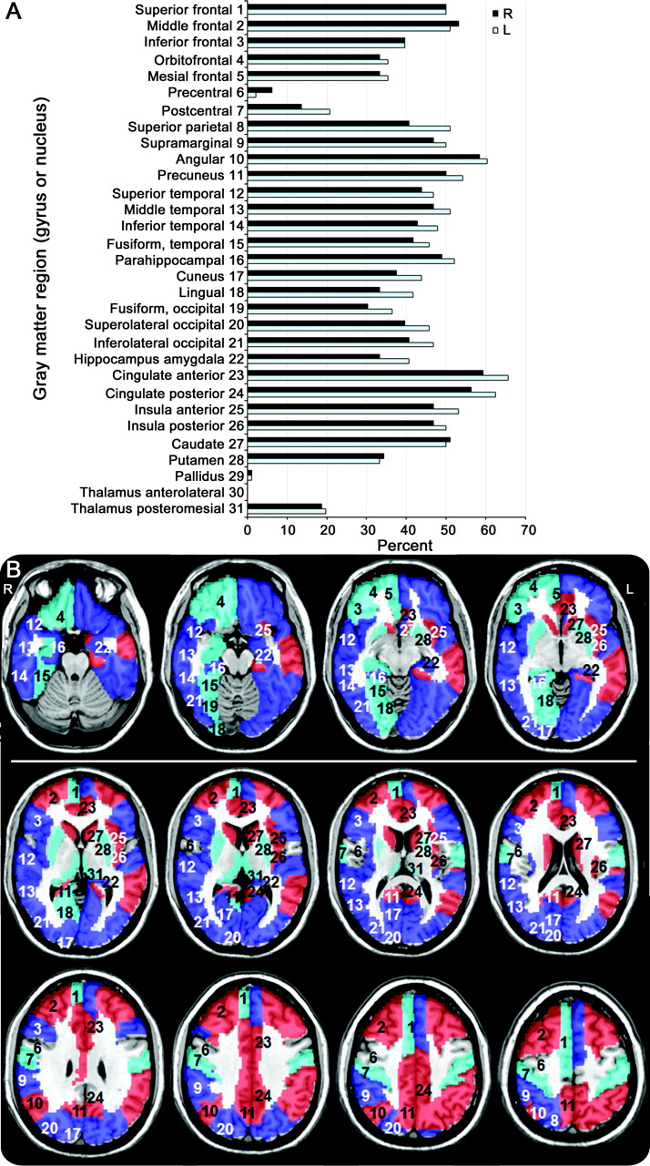 (A)百分比的主题与sCJD酒后驾车比天赋的31个大脑区域/右(黑色)和左半球(蓝色)。(B)不同颜色叠加的核磁共振频率参与31每个半球的大脑区域。浅蓝色代表参与地区10% - -35%的情况下,红色深蓝色的35% - -50%,50% - -65%。皮层区域用数字表示在右半球(21);第27 - 31边缘(22日至26日进行)和皮层下()区域显示在左半球。