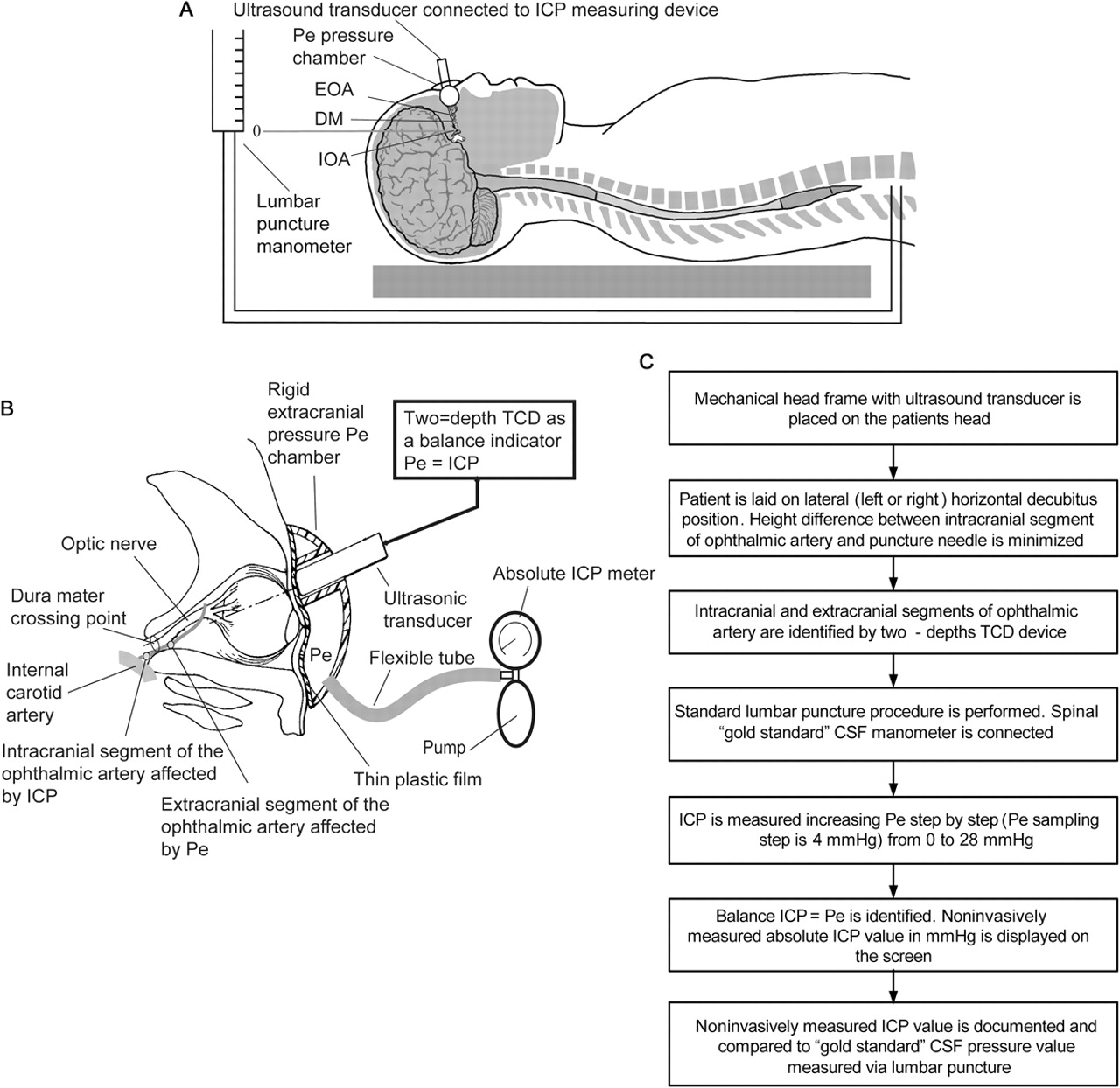 (A)的整体实验设置同步无创颅内压测量和金本位侵入性脑脊液压力测量(CSF列高度测量方法)。一个精确的脑脊液压力压力计连接到腰椎穿刺针和入侵ICP计作为黄金标准。DM =硬脑膜在视神经管交叉点,交叉的办公自动化;地址结束=眼动脉的颅外段;IOA =眼动脉颅内段。非侵入性的(B)表示ICP显示装置组件相关的眼睛/大脑解剖学。多普勒超声换能器的子系统被外部应用压力室和控制外部压力(Pe)源和测量传感器。2-depth经颅多普勒(TCD)装置是用来检测和监控从地址结束和IOA流速参数。体育是增加4毫米汞柱步骤取得一个平衡点,ICP =体育。(C)测量协议。