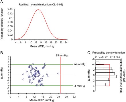 (一)正态分布的平均绝对ICP (aICP)数据组的62名患者,意味着ICP = 0.5 (nICP + P脑脊液)(nICP =无创测量ICP价值;P脑脊液=同时创脑脊液压力)来衡量。(B) Bland-Altman块成对的数据同步的ICP测量和入侵金本位ICP测量(62神经病人,72对数据);Δ= nICP−P脑脊液。(C)接近均匀分布(置信度(CL) 0.80)的绝对误差Δ。