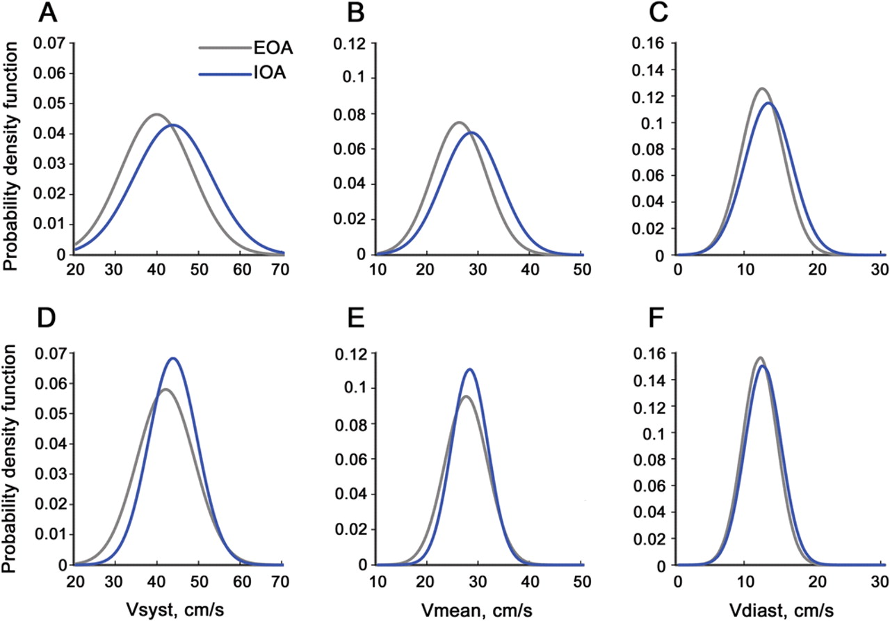在图3正常的静息状态下,你会发现(Pe = 0毫米汞柱)收缩期的分布,意思是,和舒张压流速度的IOA(右移)略高于OA的颅外段。这一发现是一致的ICP全身收缩IOA (图3a - c)。注意,这些分布变得完全重叠(图3平衡点时,D-F) Pe = ICP。这些参数来自OA血流速度脉冲波的分析显示一个正态分布(CL > 0.95)尽管有个别病人自身解剖和生理因素。这些病人自身因素包括心率、动脉血压、眼压、眶压升高、脑血管自动调整状态和眼内血管自动调整以及个体解剖和生理差异的病人。任何这些因素可以影响OA血流速度,但并没有显著影响实现的可能性,表明平衡ICP =体育。因此,nICP测量方法的系统误差接近0。我们可以得出这样的结论:OA是一个适合nICP测量的传感器,它总是可以找到一个平衡点(ICP = Pe)尽管任何影响,针对病人的个体病人的因素没有校准。