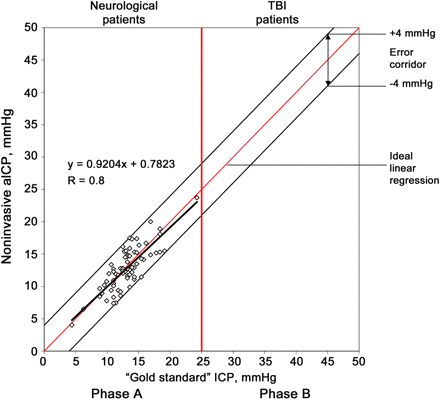一种理想化的情节我们的理想范围的颅内压(ICP)(0-50毫米汞柱)为对照比较无创性ICP方法对入侵ICP方法。叠加在该地块(一阶段)是我们的当前数据从神经病人获得覆盖脑脊液压力范围从4.5至24.3毫米汞柱。然而,这种方法有价值的监测患者创伤性脑损伤(TBI)或严重颅内出血或中风通常在重症监护管理,设备必须评估在一个更高的范围提出了ICP。这图也显示了我们计划B期临床研究中,我们将评估在重症监护室的ICP方法创伤性脑损伤患者使用脑室入侵ICP测量作为黄金标准的引用。注意,图表显示了绝对走廊(±4.0毫米汞柱);红线是腰椎穿刺脑脊液压力安全阈值的25.0毫米汞柱。意思是系统误差(准确性或偏见)的绝对测量ICP (aICP)值等于0.12毫米汞柱的SD随机误差(精密)= 2.19毫米汞柱(置信水平0.98)。
