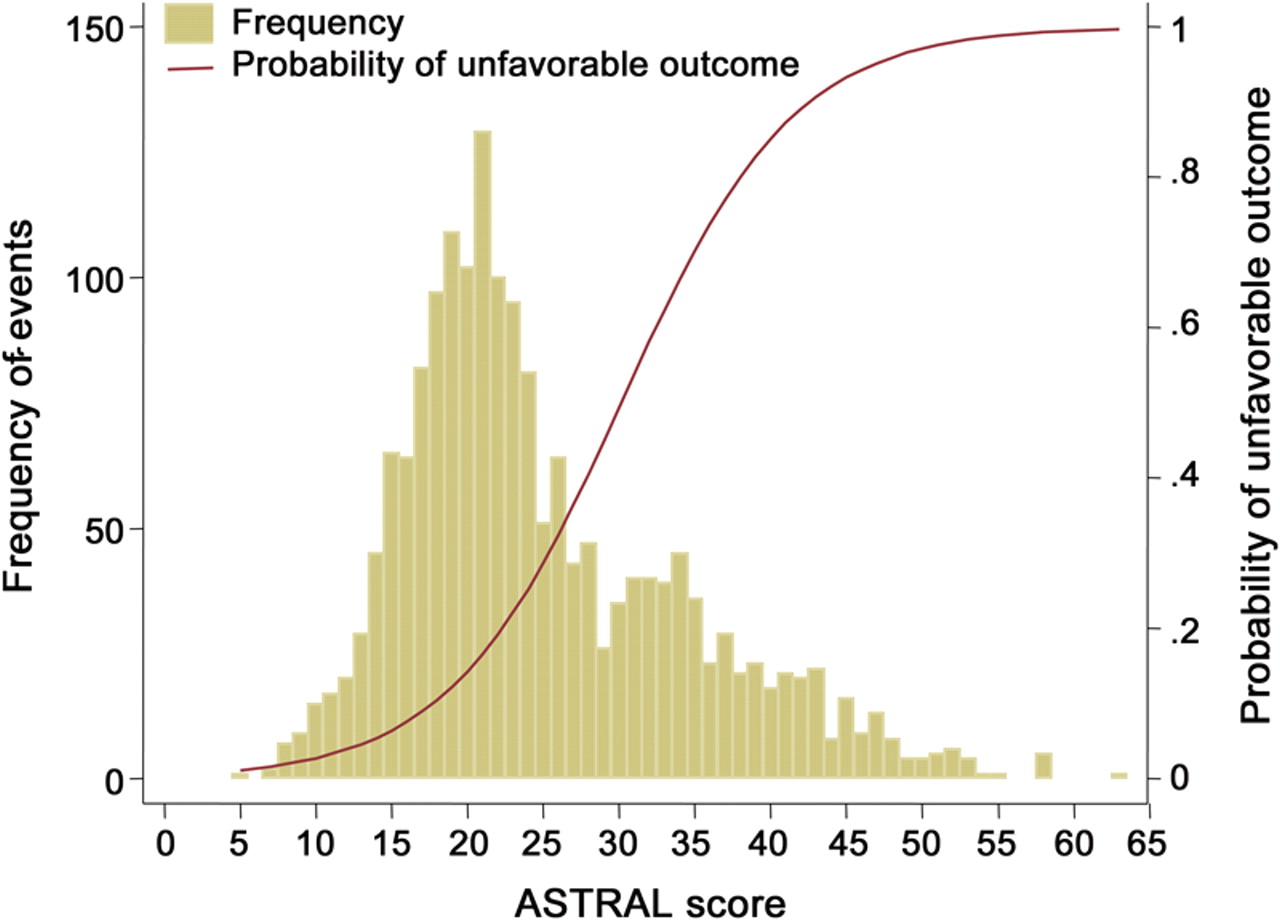 作为一个例子,一个病人和31分预测不利结果的概率为50%。竖线代表事件在任何给定的频率值的分数。星体得分=年龄、严重性、中风发病之间的时间延迟(或最后一个健康证明)和承认,视野缺损,急性葡萄糖,和意识水平。