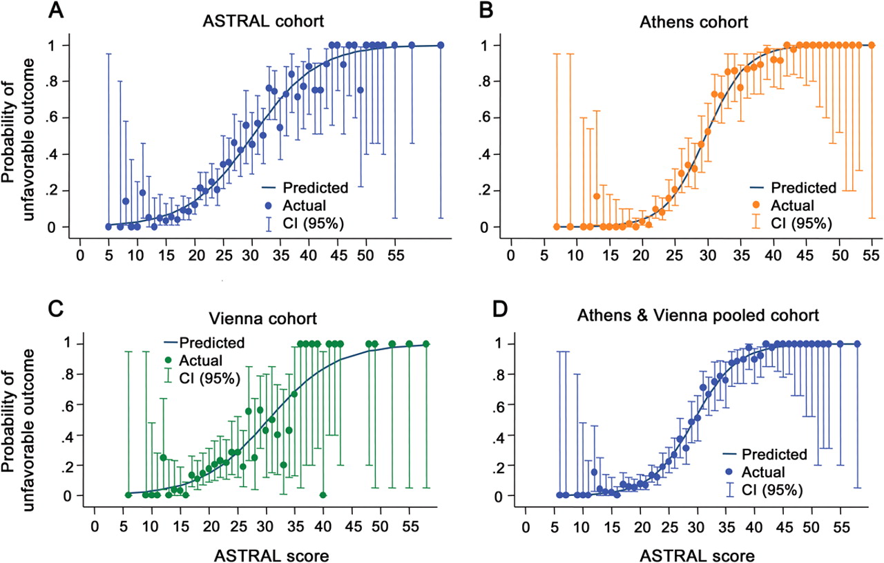 实际利率和预测不利结果的概率在3个月策划为给定值的星体得分(发病年龄、严重程度之间的时间延迟(或最后健康证明)和承认,视野缺损,急性葡萄糖,意识和水平)。数据给出了推导队列(A,急性中风洛桑(星体)的注册表和分析),为每个2外部验证组(B和C,雅典和维也纳中风注册中心,分别),后者的结合2 (D)。点代表的实际利率不利的结果。垂直线代表95%置信区间的实际利率的不利结果。实线代表的预测概率为每个数据集不利的结果。