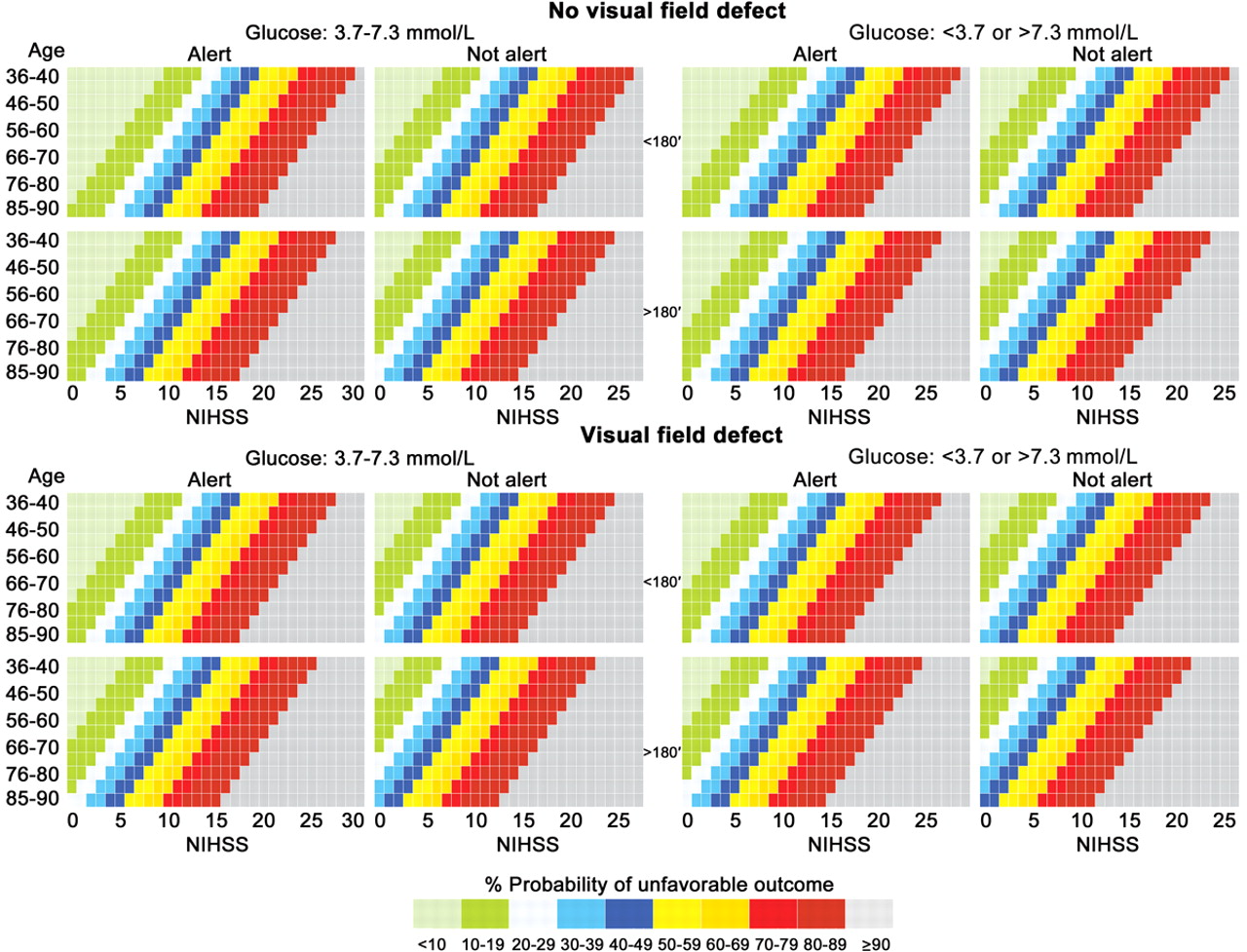 图2演示了一个颜色表不利结果的预测概率的估计来源于基于整数的分数。作为一个例子,一个81岁,以前独立正常患者的意识水平和视野缺损承认158分钟后中风发病署得分8和5.1 L更易与葡萄糖的星体得分24,因此30% - -39%概率依赖(夫人得分> 2)在3个月(或32%概率图1)。