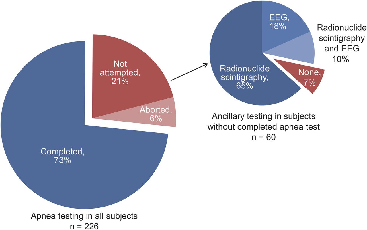 呼吸暂停测试完成于166年(73.5%)。13(5.8%)测试启动但流产,因为病人不稳定或技术困难。呼吸暂停测试并不试图在47 (20.8%)(图2)。