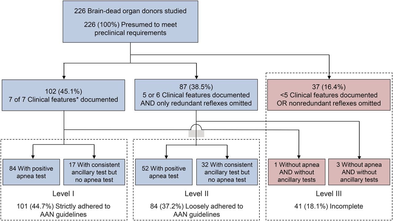 结果:二百二十六BD器官捐赠者被包括在内。练习超过建议指南河畔性能但千差万别,偏离了准则在所有其他类别。一百零二例(45.1%)有完整的文档的脑干反射消失和缺少运动反应。一百六十六人(73.5%)完成了呼吸暂停测试。60没有完成呼吸暂停测试,56例(93.3%)有辅助测试与BD一致。总的来说,101严格(44.7%)和84(37.2%)松散坚持当代河畔的指导方针。