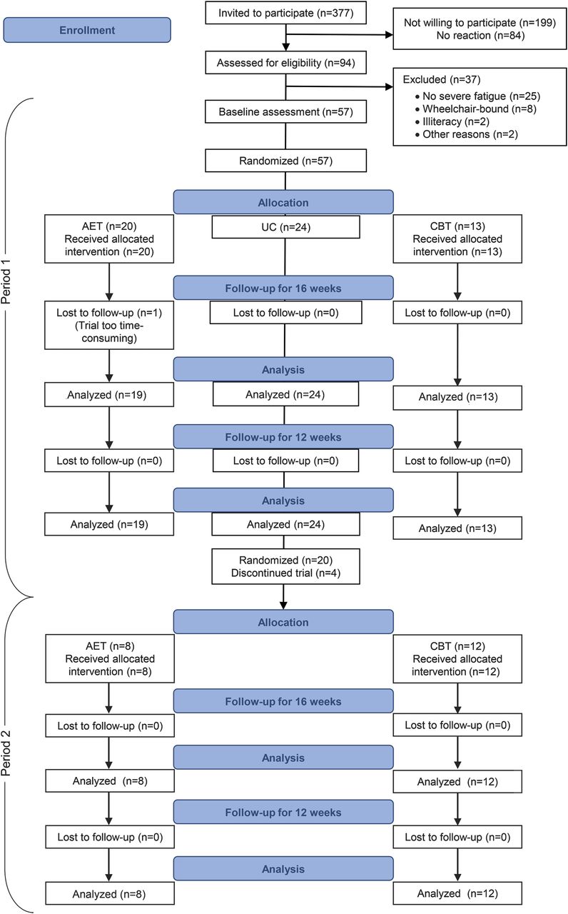 assessor-blinded,这项研究是一个多中心随机临床试验使用重复测量。一个独立的研究助理分配每个参与者让16周,CBT,或加州大学使用一个计算机生成的随机块列表。块大小不同的随机为了防止分配过程的可预测性。随访12周后,共有28周后(即,period 1), the patients in the UC group were randomly allocated to 16 weeks AET or CBT followed by another 12 weeks of follow-up (i.e., period 2: 28 weeks). The interventions were performed at 9 health care institutions for convenience of the patients.
